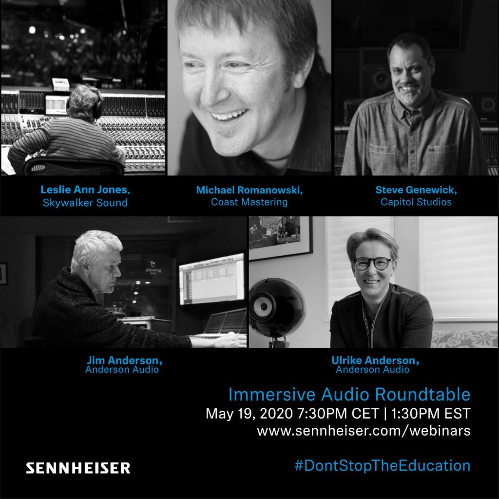 El 19 de mayo, la SoundAcademy de Sennheiser discutirá uno de los temas más importantes del día: audio inmersivo. Los anfitriones de Sennheiser, David Missall y Brian Walker, invitaron a Leslie Ann Jones, Michael Romanowski, Steve Genewick, Jim Anderson y Ulrike Anderson para hablar sobre esta emocionante área. Los cinco expertos de la industria discutirán su enfoque para grabar, mezclar y masterizar la experiencia de sonido envolvente, y compartirán sus puntos de vista sobre cómo el audio inmersivo puede ayudar a abrir nuevas posibilidades creativas y conectar a los oyentes más íntimamente con la música. Tenga en cuenta el nuevo horario modificado para este seminario web: tendrá lugar a las 19:30 CEST (13:30 EST). Las inscripciones ya están abiertas en: https://zoom.us/webinar/register/WN_kiCShCe4SX2EjaClcVz-Sg