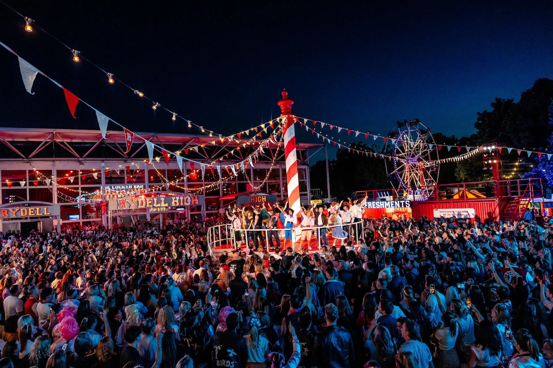 El diseñador de sonido Gareth Fry explica las exigencias únicas de la producción: “Es un recinto enorme. Todo es un escenario, todo es un espacio para el público. Las actuaciones y el público se integran entre sí y ese fue uno de los puntos clave del espectáculo: crear ese efecto inmersivo y hacer que el público se sienta como si estuviera completamente inmerso en el mundo de Rydell High y en las icónicas escenas de Grease”.