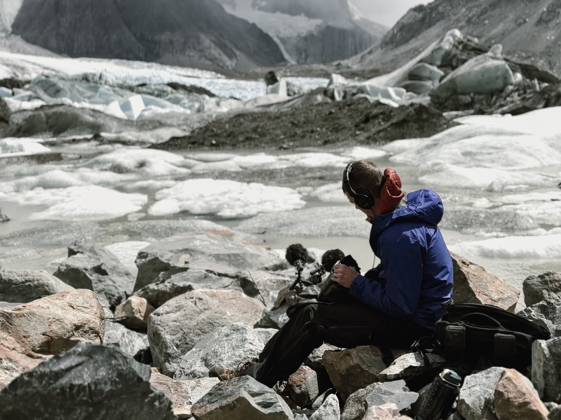 “Cuando escuché por primera vez estas grabaciones, pensé que eran horribles, suenan terribles a velocidad normal. Sin embargo, cuando se baja el tono dos octavas, de 192kHz a 48kHz, ocurre la magia. La forma en que las gotas de lluvia caen sobre el agua hace que la lluvia sea mucho más ultrasónica, lo que hace que suene silbante y penetrante a velocidad normal. Pero cuando se reduce la velocidad, suena increíble. La mayoría de estas grabaciones se realizaron en una laguna glaciar en condiciones extrañas. Todos los icebergs se agruparon y se frotaron entre sí debido a una península rocosa que permitió que pasara un poco de agua pero mantuvo a los icebergs confinados. Los icebergs eran tan densos que no había suficiente espacio para que el viento creara olas. Los vientos salvajes de la Patagonia azotaron los icebergs, pero todo lo que pudieron hacer fue frotarse entre sí. Crujieron, gemieron, ronronearon, gruñeron y crepitaron. Agregar lluvia a la mezcla creó un paisaje sonoro meteorológico asombroso donde los crujidos de los icebergs y los chirridos de las burbujas reemplazaron los emotivos crujidos de las ramas y el canto de los pájaros de un bosque real en una tormenta”.