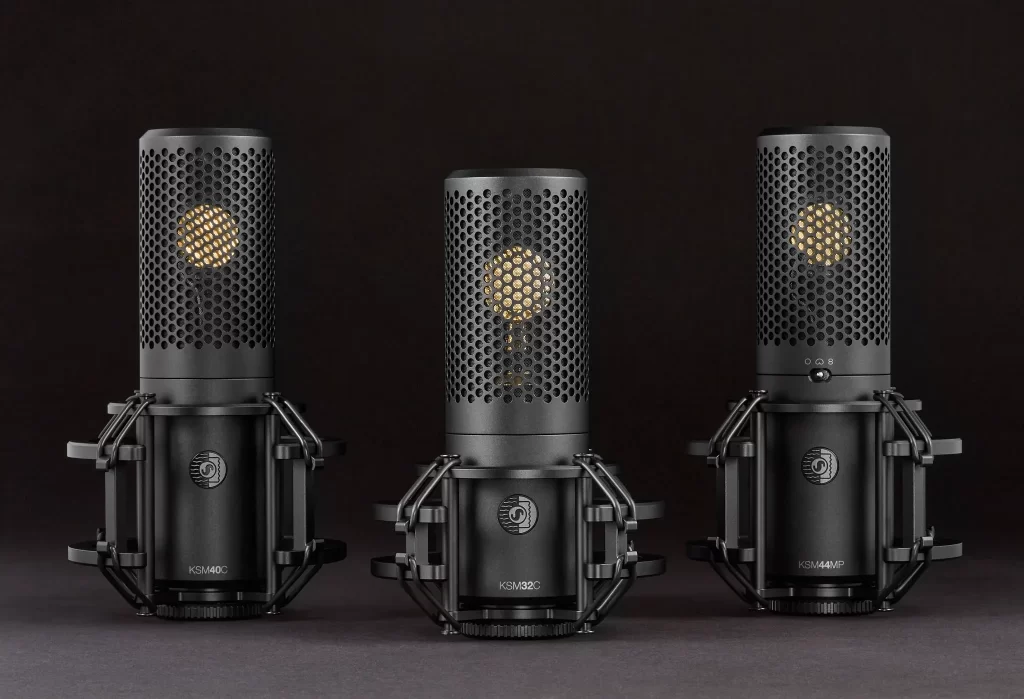 - KSM32C/SM – Micrófono de condensador cardioide (Kit de estudio): Incluye un micrófono de condensador cardioide KSM32C, montura antivibratoria, filtro antipop magnético, estuche de transporte premium con cremallera, juego de 8 bandas de repuesto para la montura antivibratoria y adaptador de rosca.