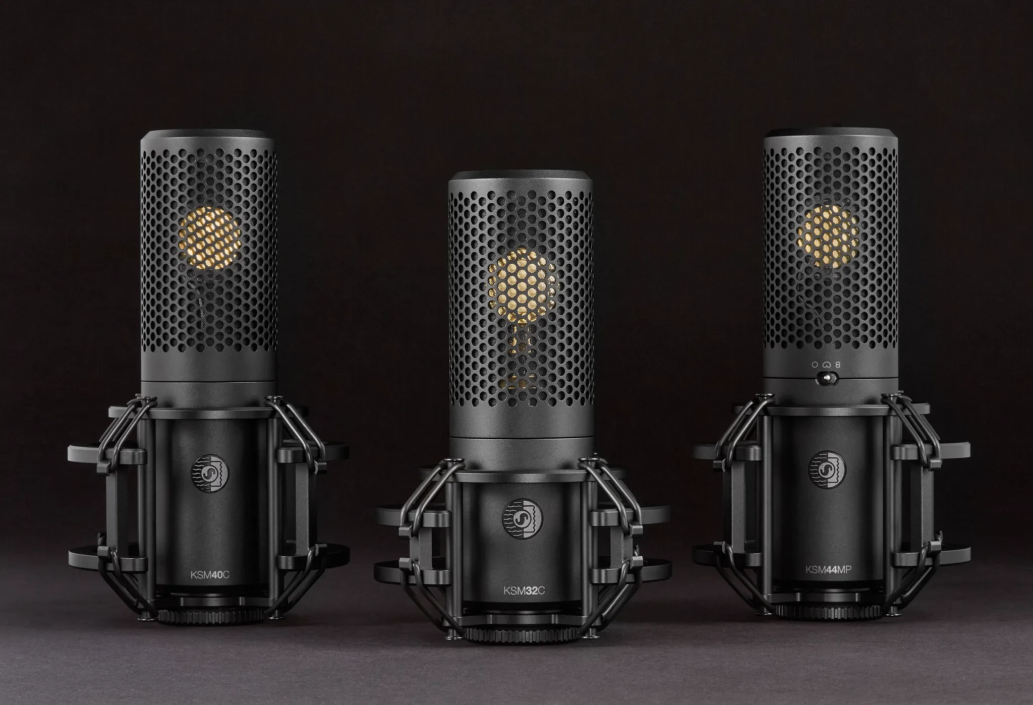 - KSM44MP – Micrófono de condensador multipatrón de diafragma grande: Incluye un micrófono de condensador multipatrón de diafragma doble KSM44MP, montura antivibratoria, filtro antipop magnético, estuche de transporte premium con cremallera, abrazadera de micrófono giratoria (montaje rígido), juego de 8 bandas de repuesto para la montura antivibratoria, adaptador roscado.