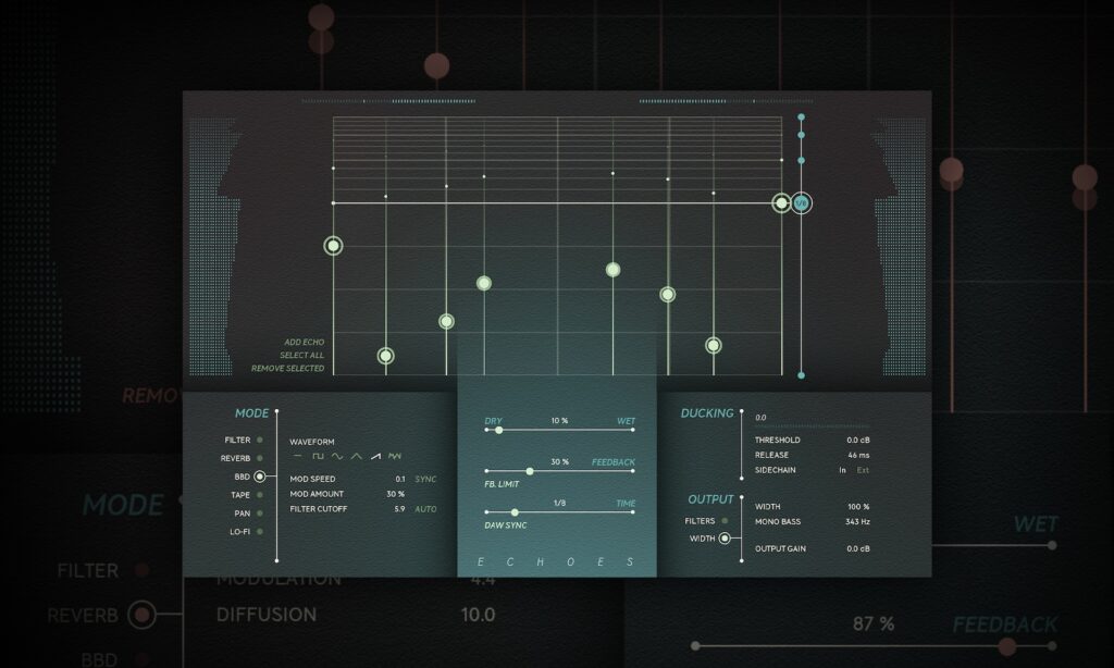 Echoes cuenta con seis modos diferentes que brindan una variedad de colores para elegir. El filtro es perfecto para voces, mientras que el modo Reverb es ideal para sintetizadores y guitarras. BBD, o Bucket Brigade Device, es la tecnología detrás de esos famosos pedales de sonido cálido de los años 70, completos con los deseados artefactos de aliasing. El modo Tape se basa en máquinas de eco de cinta inmortalizadas en innumerables discos. Pan es ideal para ampliar fuentes mono y agregar movimiento a sonidos estáticos, y la degradación sucia del modo Lo-fi es excelente para ser creativo.