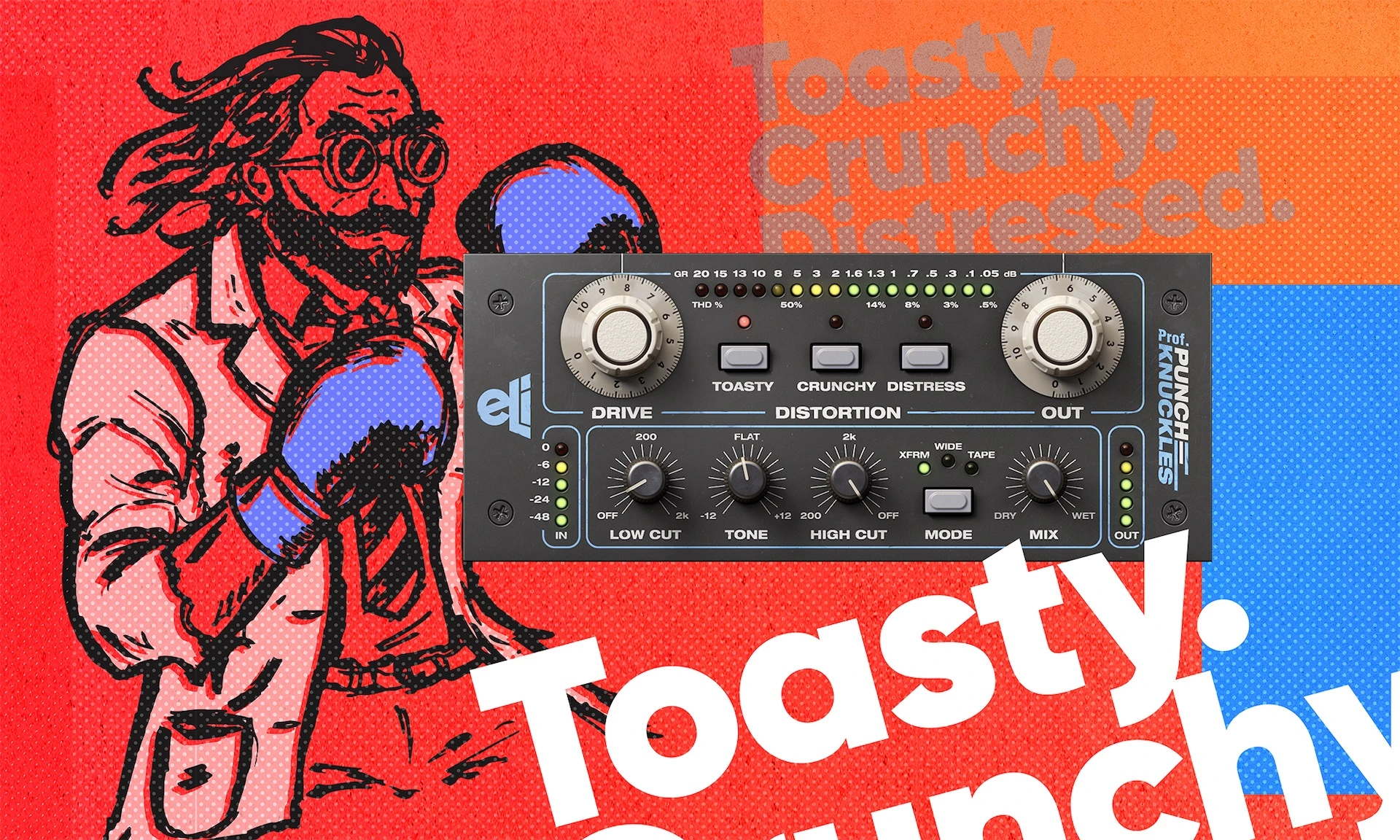 Professor Punch-Knuckles es más que fuerza bruta. Su lado sofisticado reside en tres tipos distintos de distorsión/saturación modelada: Toasty, Crunchy y Distress. Toasty y Crunchy se basan en la saturación y la distorsión de preamplificador de Mike-E. Distress se origina en el circuito compresor de Distressor y Mike-E. Su interfaz fácil de usar es la forma más rápida de llevar tu sonido desde cálidos tonos vintage, pasando por una suave ruptura, hasta el sonido clásico de distorsión/compresión de Distressor de Empirical Labs.