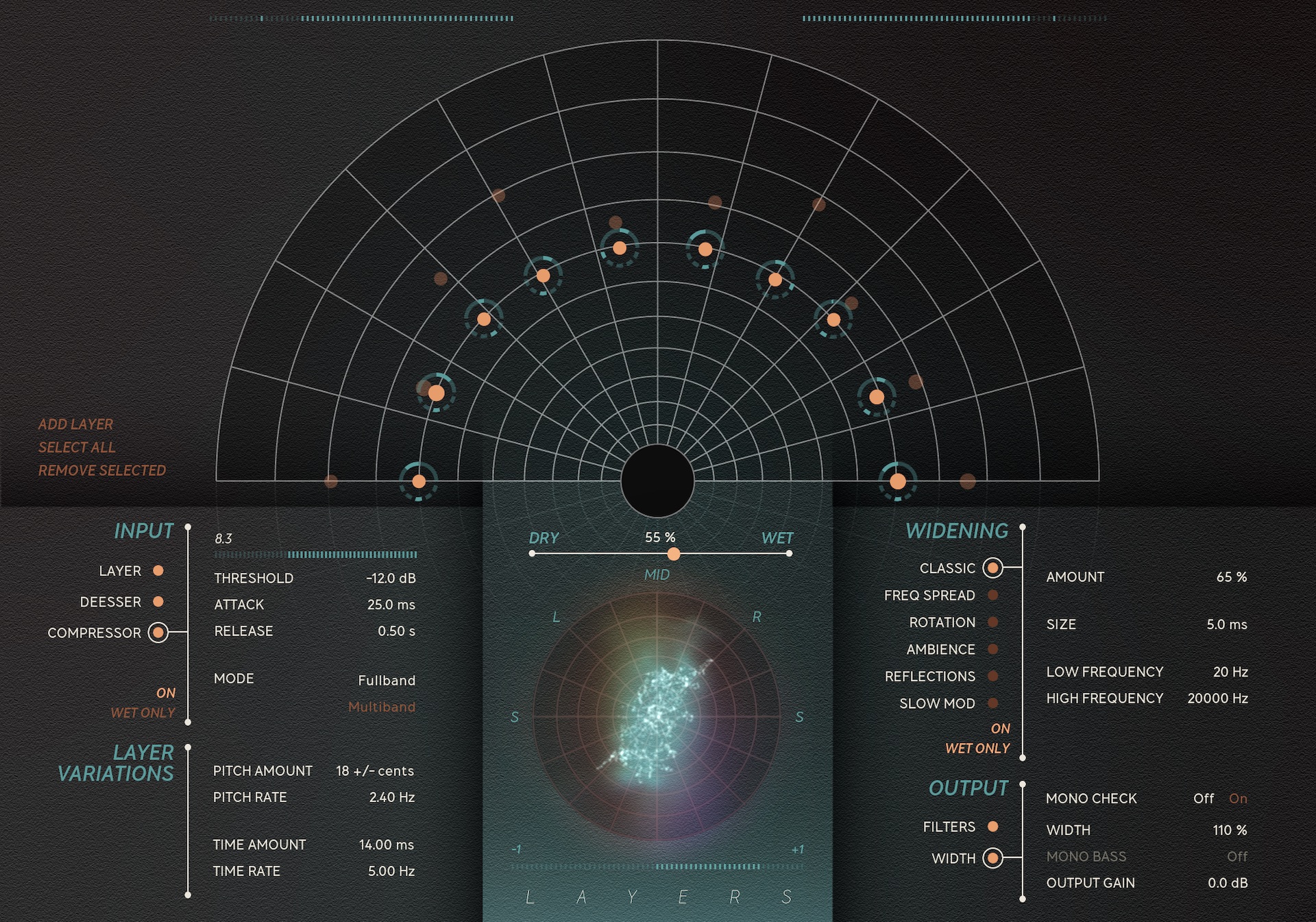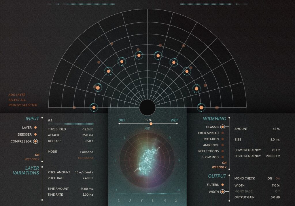 Layers contiene algoritmos de ampliación de primera clase, como los que se trasladaron del popular Softube Widener. El nuevo tipo de modulación lenta, inspirado en las legendarias y buscadas unidades rack de chorus utilizadas por Stevie Ray Vaughan, Kate Bush, Peter Gabriel y otros, llevará a los usuarios a otra dimensión.