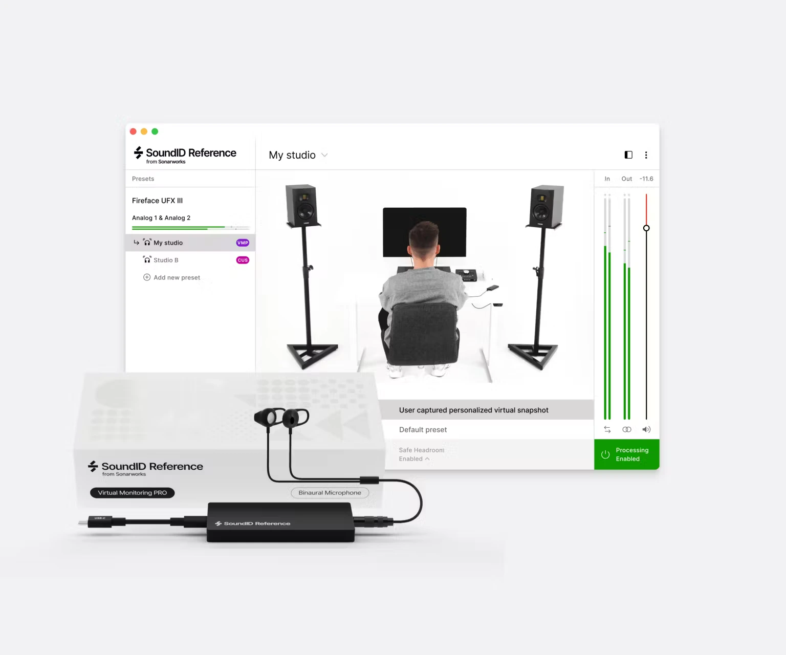 Virtual Monitoring PRO con micrófono binaural intraaural (componente de hardware) ofrece una simulación de sala ultra-realista en auriculares, permitiendo a los usuarios capturar el sonido de su estudio con los auriculares que prefieran