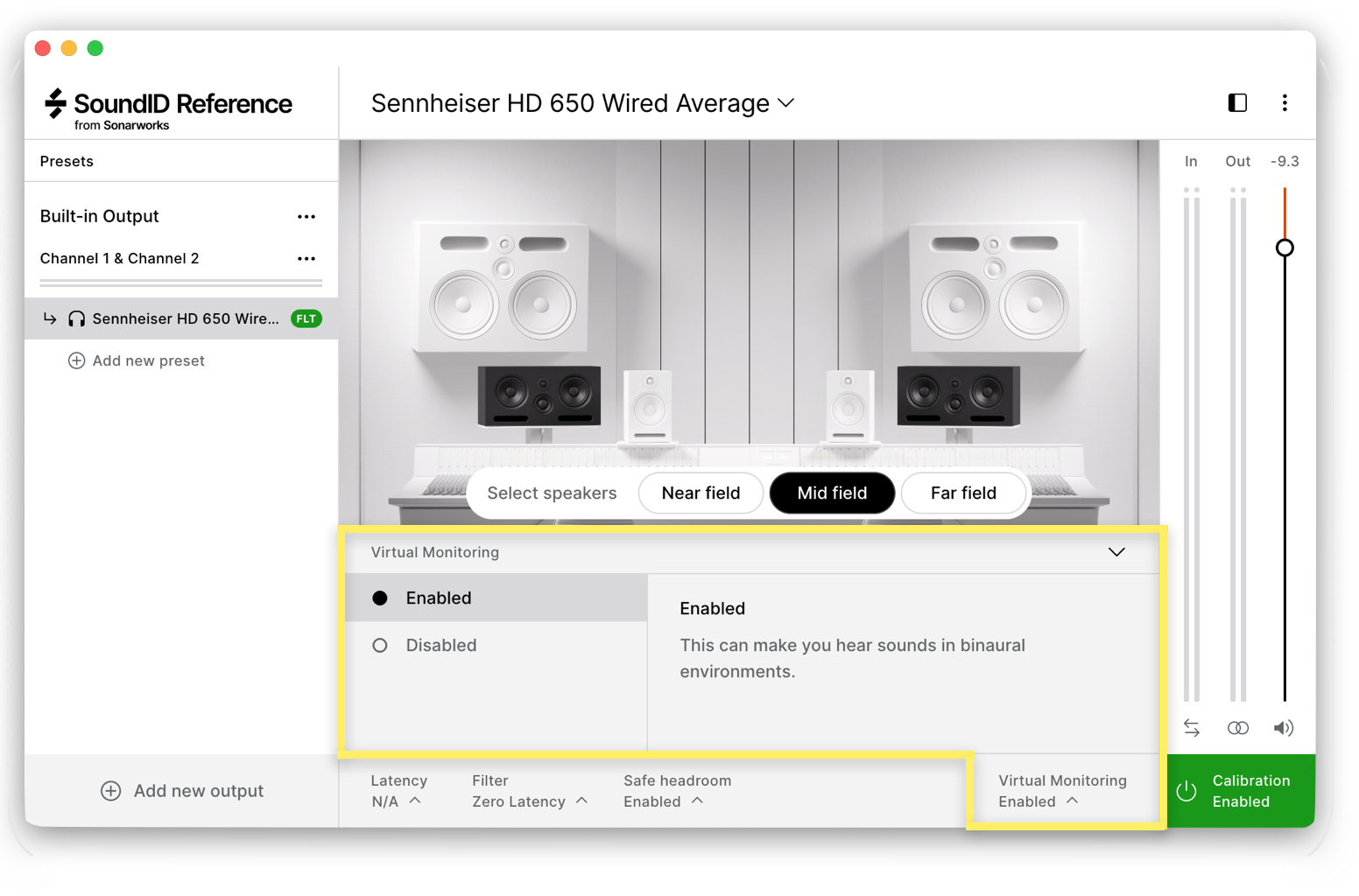 SoundID Reference Virtual Monitoring ofrece la simulación más precisa de monitores de estudio estéreo en tus auriculares, lo que te permite mezclar como si estuvieras trabajando en monitores de estudio. Cambie entre monitores de campo cercano, de campo medio y de campo lejano, todos ajustados con precisión al sonido de referencia en el que confían los más de 160.000 ingenieros en todo el mundo. También puede ajustar la respuesta de frecuencia objetivo o incluso simular varios entornos asombrosamente realistas. Todas las funciones de monitorización virtual están disponibles en cualquiera de los 500 modelos de auriculares compatibles, lo que te permite tener un control total sobre tus decisiones de mezcla con total confianza.