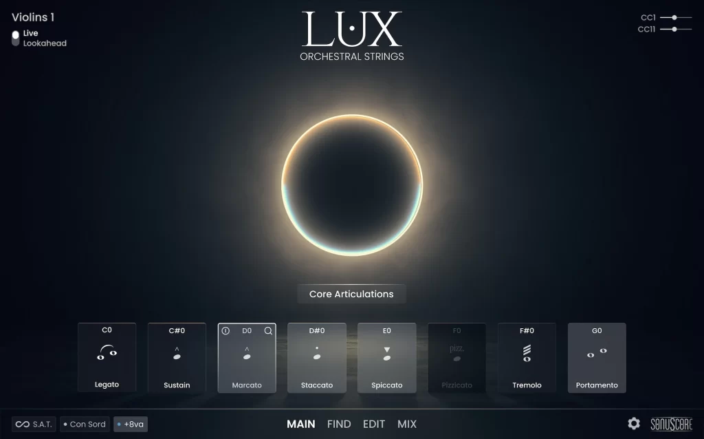 - LUX te permite hacer algo que las bibliotecas de samples rara vez logran: dar forma a las articulaciones como si tuvieran vida propia. Usando la rueda de modulación, puedes combinar fluidamente dos o más articulaciones en tiempo real. Los sustains pueden fundirse en trémolos, las texturas sul ponticello pueden expandirse hasta convertirse en atmósferas brillantes y un staccato puede transformarse en un potente sforzando con un solo movimiento. Esto le da a la escritura una sensación de evolución y dinamismo, convirtiendo parches estáticos en interpretaciones vivas que responden al toque del intérprete.