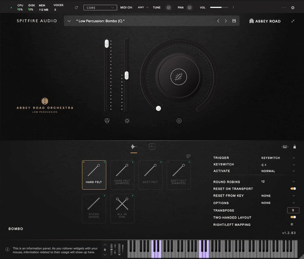Elevando eficazmente los ritmos con detalles vibrantes, la claridad y la complejidad de ABBEY ROAD ORCHESTRA: HIGH PERCUSSION CORE se deben a la misma selección de 62 increíbles instrumentos incluidos en el paquete ABBEY ROAD ORCHESTRA: HIGH PERCUSSION PROFESSIONAL, que abarca desde el nítido chasquido de tres impecables cajas hasta congas, rototoms y mucho más. Esto es, sin duda, más que suficiente para dar vida a las aspiraciones rítmicas de cualquiera. Asimismo, HIGH PERCUSSION CORE también ofrece idéntico nivel de detalle en la selección de sus (391) articulaciones, mazos y técnicas disponibles, todas interpretadas por el virtuoso percusionista Joby Burgess. De hecho, HIGH PERCUSSION CORE vuelve a enfatizar las características matizadas de LOW PERCUSSION CORE, demostrando debidamente su capacidad de respuesta dinámica para incluir también RIGHT/LEFT MAPPING, SOFT TAKEOVER (activa la dinámica del rollo intuitivamente a través de la velocidad de la tecla mientras que también conserva la funcionalidad de la rueda de modulación), TWO-HANDED LAYOUT (refleja las teclas asignadas más arriba en el teclado para permitir flexibilidad y velocidad al tocar) y VOICE CHOKING (controla con precisión las técnicas de final de rollo al presionar las teclas golpeadas correspondientemente). Todo permite una interpretación instintiva y gratificante.