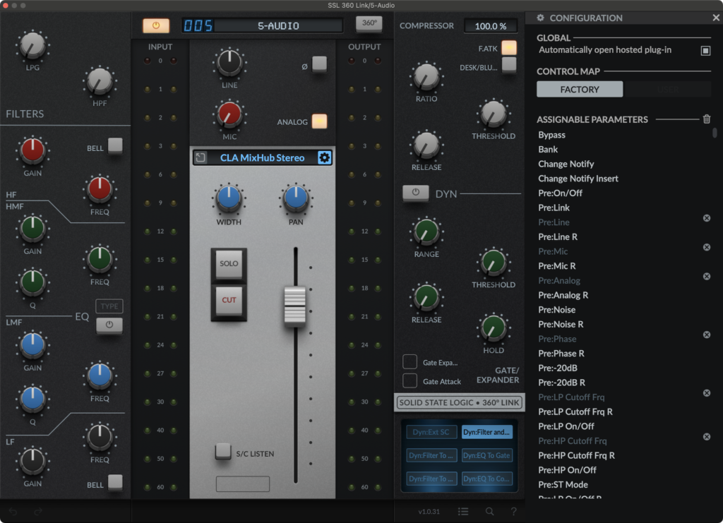 SSL 360° Link viene con una selección de mapas de fábrica personalizables para plugin de canal SSL populares como Slate Digital®, Harrison Audio®, Universal Audio®, Waves® y Brainworx®. Si bien UC1 está optimizado para un diseño de canal típico, cualquier plugin se puede mapear rápidamente utilizando la herramienta de mapeo fácil de usar.