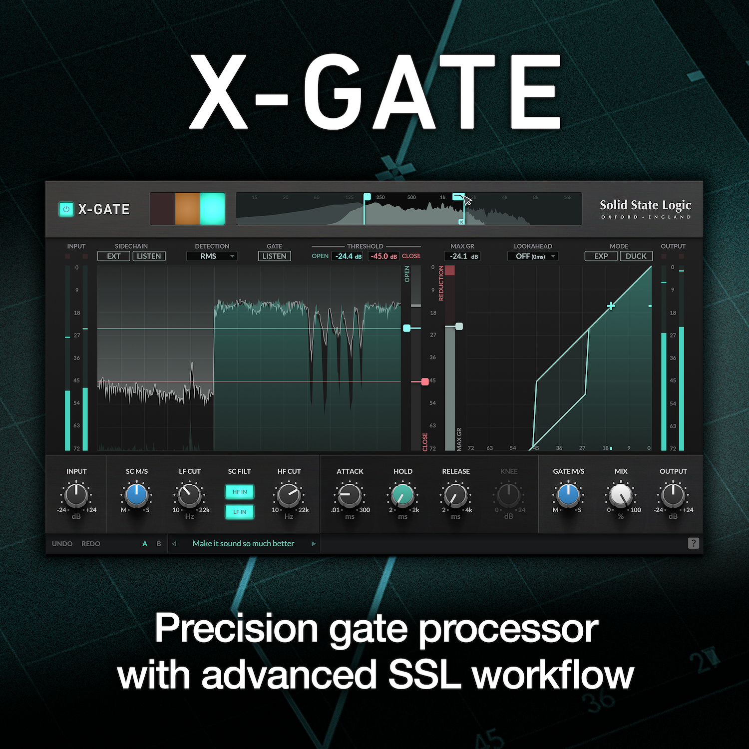 Con un gráfico de forma de onda móvil, opciones de procesamiento mid/side e histéresis modificable mediante umbrales abiertos y cerrados independientes, X-Gate se basa en el reconocido conocimiento de la empresa sobre puertas de hardware, todo entregado a través de la interfaz de flujo de trabajo avanzada de SSL. El nuevo plugin es adecuado tanto para creadores de música como de contenido y ofrece una gama única de funciones para esculpir sonido extendido: una herramienta invaluable para diseño de sonido, restauración de audio y, por supuesto, mezcla.