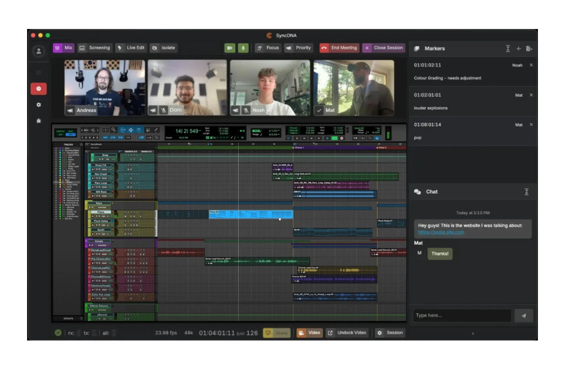 Basada en la misma tecnología que impulsa las herramientas empresariales de SyncDNA para audio de alta gama para cine, televisión y videojuegos, SyncDNA SONIC ofrece funciones de colaboración de nivel profesional a la comunidad creativa de audio en general. Ofrece videoconferencia integrada, transmisión de audio con precisión de muestreo, números de compás sincronizados en DAW, uso compartido de marcadores, uso compartido de pantalla y chat en vivo, todo en una única plataforma unificada.