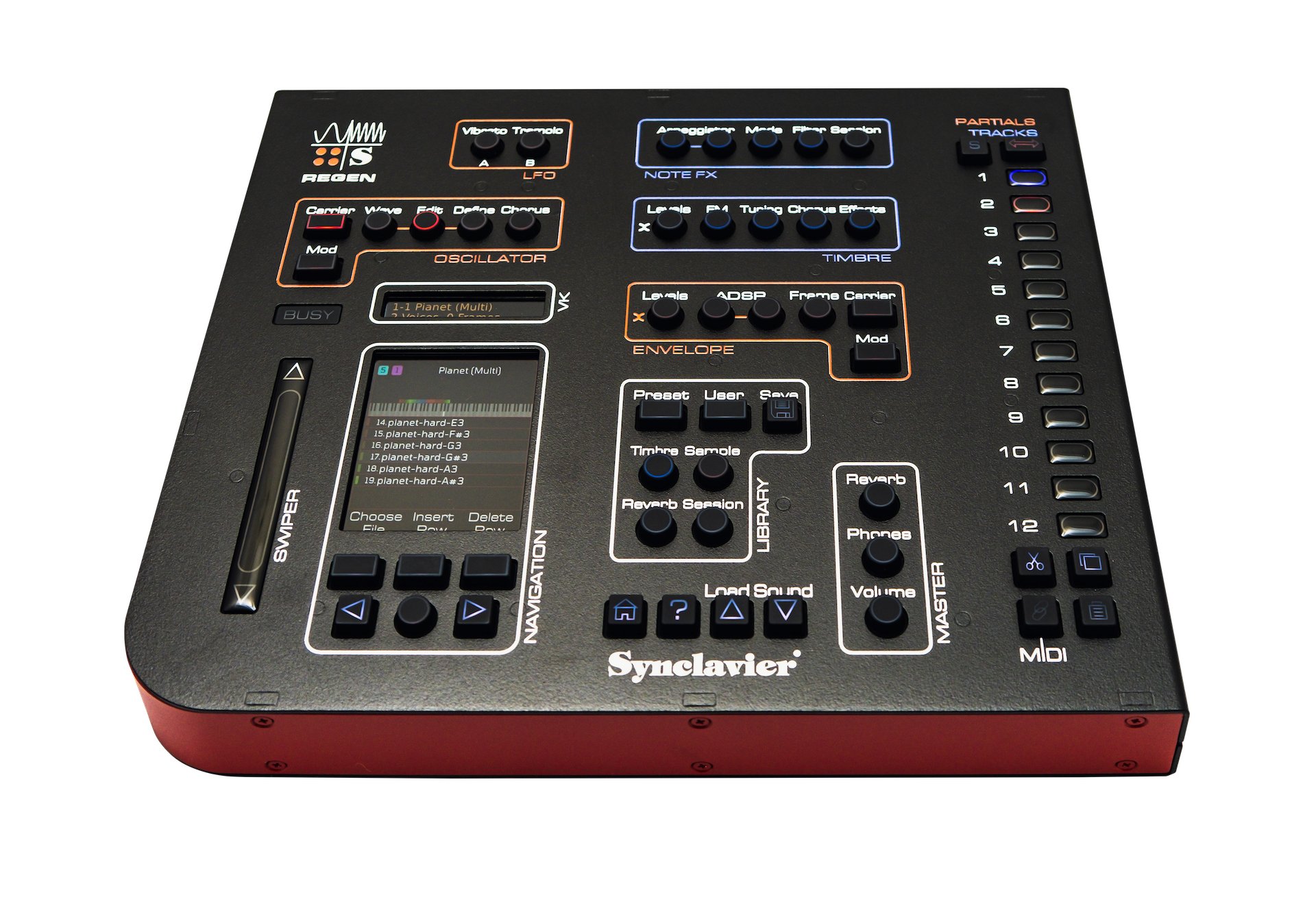 Después de un período de desarrollo de dos años que condujo a su lanzamiento preliminar a fines del año pasado, Regen de Synclavier Digital se prepara y estabiliza para su uso en un entorno moderno como un sintetizador de escritorio atemporal diseñado de manera distintiva en torno a un formato robusto y apto para mochila. Con 31 cm. (ancho) x 26 cm. (largo) x 4,2 cm. (alto), una carcasa de aluminio con un peso de 1,8 kg y un acabado en negró con una textura de arena complementada con un marco ‘Synclavier-red’, además de características ergonómicas como cumplimiento de montaje VESA. La conectividad abunda con puertos MIDI IN y THRU proporcionados en conectores TRS de 1/8” junto con un conector Phones TRS (para auriculares de 32 Ω – 300 Ω para monitorear el audio maestro con control de volumen independiente); Salidas balanceadas estéreo acopladas a CC (L y R) en conexiones XLR (para uso en estudio a 4dBu de nivel profesional, con GND ); Salidas de un solo extremo estéreo acopladas a CC (L y R) en conexiones TS; Puerto HOST USB (para conectar a una computadora para entrada MIDI desde un DAW); cuatro puertos USB para accesorios (para conectar controladores de teclado MIDI, secuenciadores e interfaces de audio, o incluso un Synclavier® KNOB independiente y un lector de tarjetas SD (para bibliotecas ilimitadas de muestras y timbres de usuario por encima y más allá del contenido de fábrica integrado de 1 GB de Regen). Sin embargo, es la interfaz de usuario única de Regen lo que lo distingue del paquete de producción actual, dominado como está por dos gloriosas pantallas OLED sumergidas a todo color con gráficos animados avanzados, que comprenden al mismo tiempo una llamada pantalla VK, que imita la pantalla de la edición de nivel superior Synclavier® II VPK que surgió en 1985, así como una pantalla modal principal que domina el panel de NAVEGACIÓN que muestra los parámetros actuales, la configuración del usuario, la biblioteca de timbres y más. Mientras tanto, los botones de parámetros retroiluminados sensibles se agrupan en consecuencia, complementados con 12 botones selectores sensibles al tacto que pueden manejar gestos para seleccionar rápidamente múltiples PARTIALS o TRACKS, mientras que el SWIPER de valor vertical tiene una precisión táctil de 128 niveles de resolución para un control preciso de cada parámetro como un control deslizante capacitivo de perilla virtual con recubrimiento epoxi.