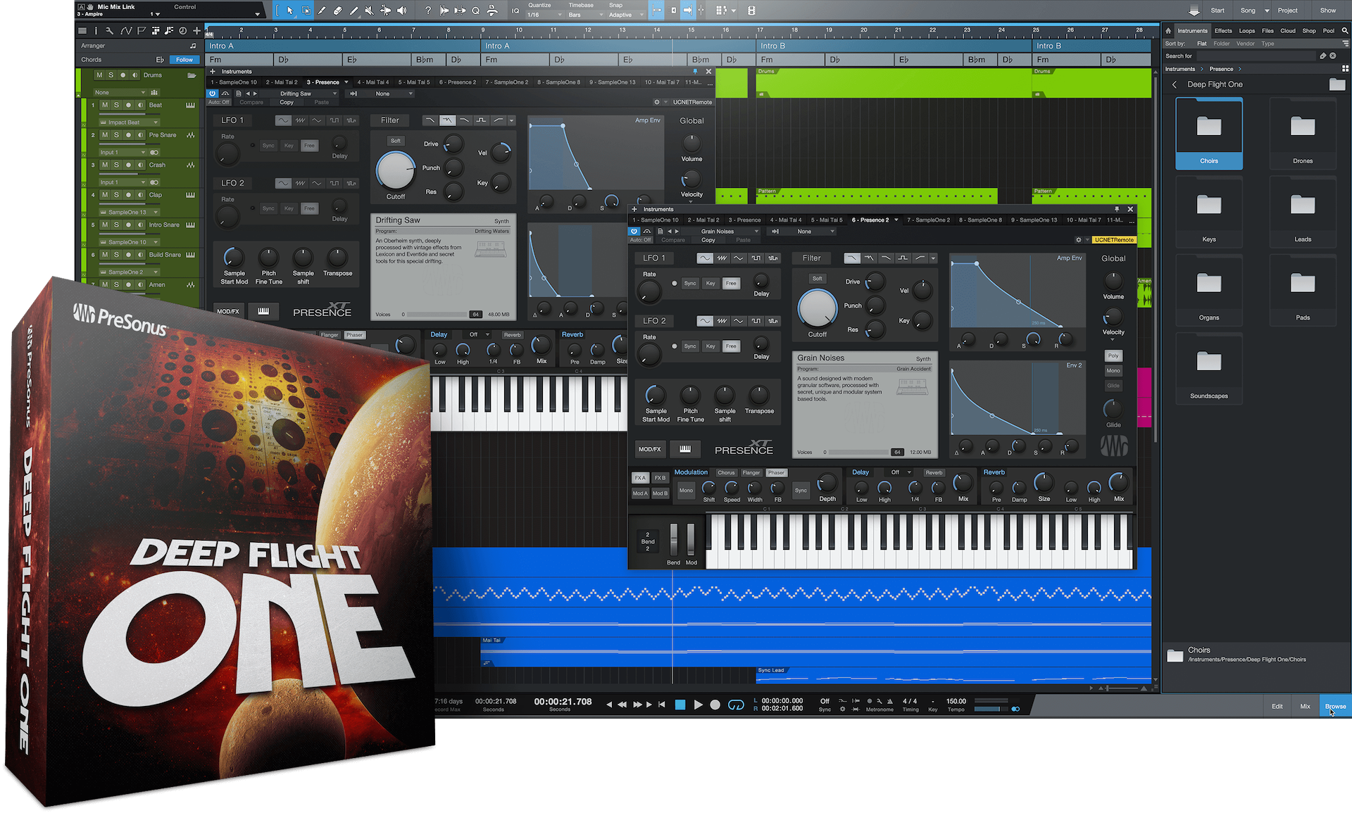 Con un enfoque de síntesis modular híbrida, la biblioteca de instrumentos Deep Flight One de PreSonus® para el sampler Presence…