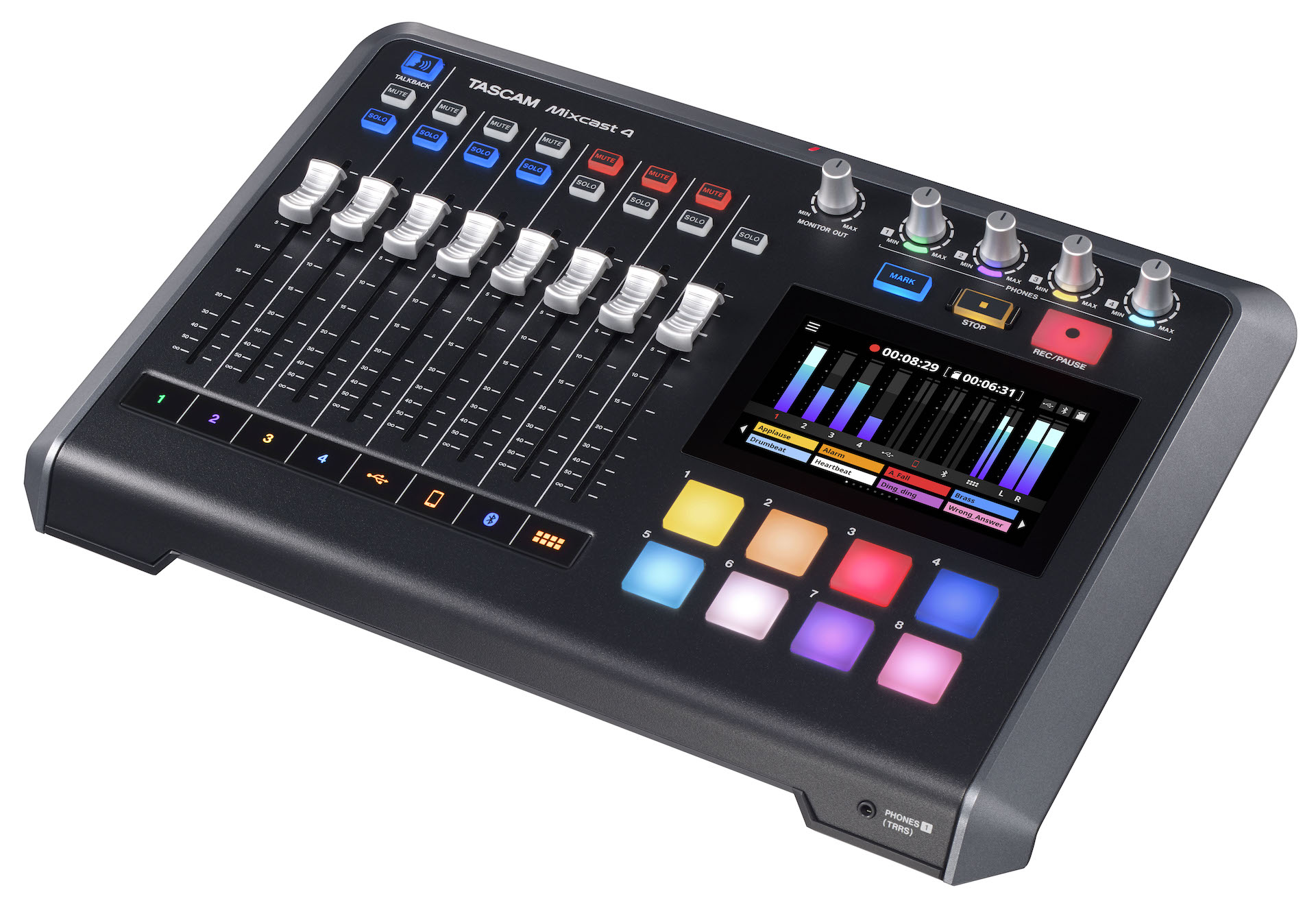 Igualmente convincente en la actualización V1.30, está la capacidad de cambiar entre los bancos de pads de sonido mientras se graba. La TASCAM Mixcast 4 tiene una matriz de 8 pads de 8 bancos que permite que 64 sonidos residan en los pads de sonido. Estos bancos pueden ahora cambiarse mientras se está en el modo de grabación, facilitando así el acceso a los 64 sonidos durante la grabación.