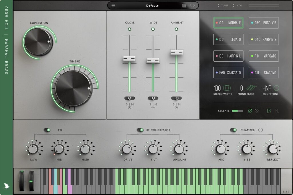 Esta es una biblioteca que se divide en una jerarquía ligeramente diferente en comparación con las ofertas anteriores de The Crow Hill Company. A primera vista, los presets son configuraciones de complementos que albergan articulaciones, que son en sí mismas una selección de diferentes estilos de interpretación a los que los usuarios pueden cambiar mediante interruptores de teclas (codificados por colores), mientras que todos los cambios realizados en el panel frontal, como el balance del micrófono (CLOSE, WIDE y AMBIENT) y la cantidad de reverberación (CHAMBER), permanecerán iguales independientemente de qué articulación esté “activa”. LONGS (notas largas en loop que se pueden reproducir como líneas solistas o, de hecho, acordes (controlados con la rueda de modulación o un controlador de fader asignado a MIDI CC1), las SHAPES mencionadas anteriormente y SHORTS (notas y punteos más cortos que, de forma predeterminada, están controlados en gran medida por la velocidad que determina la intensidad y el timbre del tono) son las tres categorías clave de tipo de articulación que también se utilizan para organizar los presets.