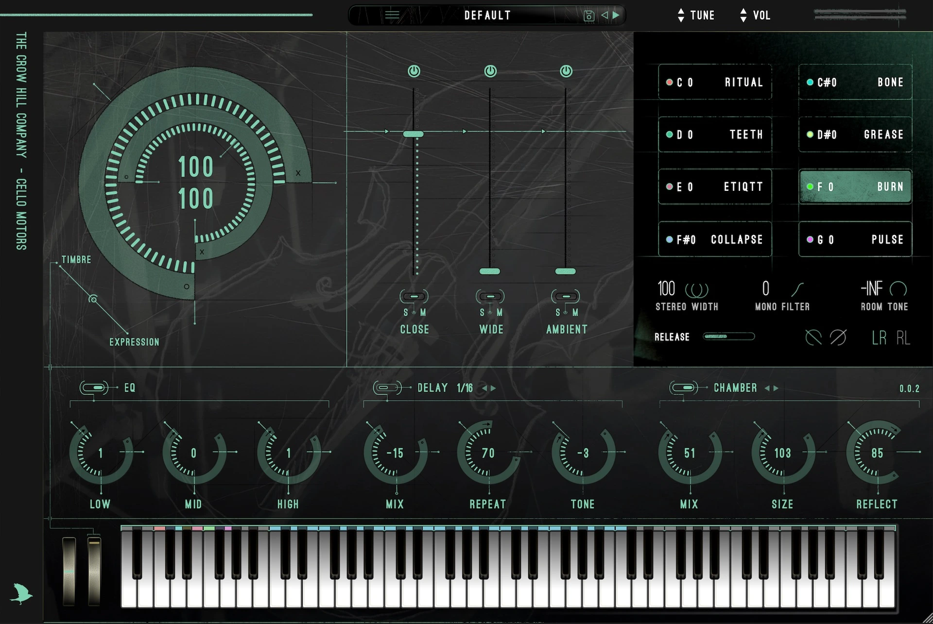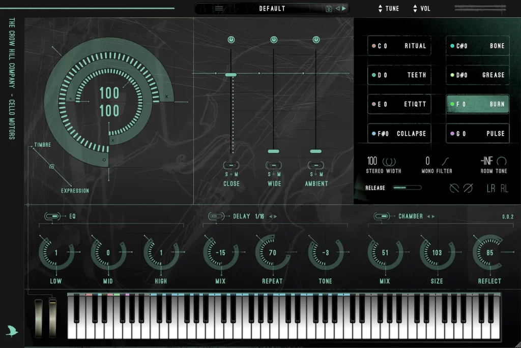 Como siempre, una magnífica interfaz gráfica de usuario, típica de la aclamada atención al detalle de The Crow Hill Company, garantiza que CELLO MOTORS sea tan agradable de tocar como de escuchar: imagine teclas de colores llamativos que indican la ubicación de los interruptores; una ventana de articulación activa que muestra la articulación determinada por esas teclas, con un código de color que indica el color de tecla correspondiente y una ventana de ubicación de los interruptores que muestra la ubicación de la tecla seleccionada. Los controles maestros avanzados para quienes deseen profundizar un poco más incluyen STEREO WIDTH (expansión estéreo): ajusta la amplitud estéreo del instrumento; ROOM TONE (ruido): ajusta la cantidad de sonido ambiental; MONO FILTER (filtro mono): ajusta la frecuencia a la que la señal se convierte a mono; RELEASE (liberación): ajusta los tiempos de la envolvente de liberación (solo de los largos); PHASE (fase): invierte la fase del instrumento y LR RL (intercambio estéreo): ajusta la asignación de canales del instrumento.