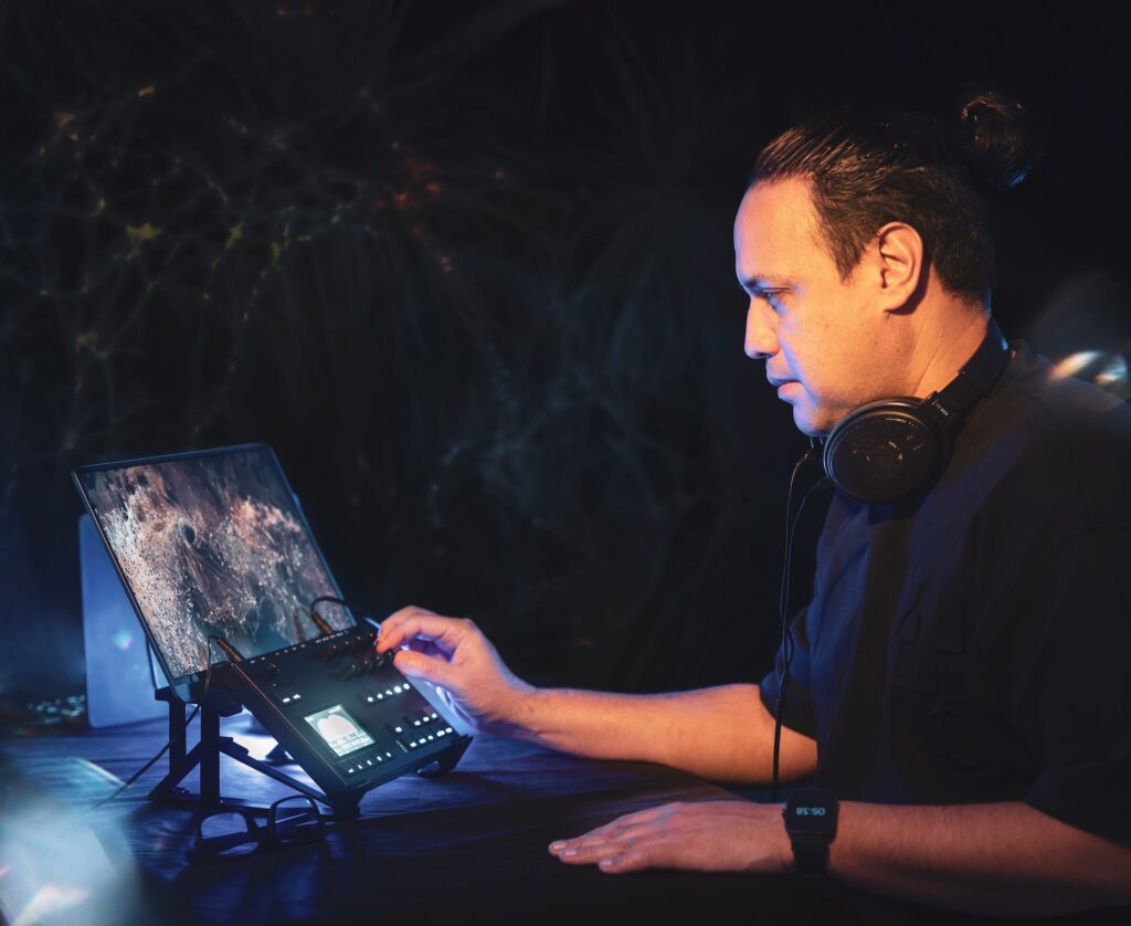 Con una agenda agitada que abarcaba Panamá, Miami, España y Dinamarca, Merel se vio presionado a encontrar una herramienta que pudiera capturar la esencia etérea de estas obras de arte redescubiertas. Por casualidad, descubrió que Torso Electronics estaba ubicada justo en Copenhague, un golpe de suerte inesperado que definiría la dimensión sonora de la exhibición. Desde la superposición de texturas delicadas hasta la activación de reverberaciones expansivas, las capacidades en tiempo real del S-4 reflejaban las imágenes generativas en exhibición. “Necesitaba algo que pudiera pintar con sonido, capturando tanto la sutileza como la grandeza de estas narrativas olvidadas”, explica Merel. “El S-4 me dio la libertad de experimentar y responder sobre la marcha, exactamente lo que esta instalación exigía”.