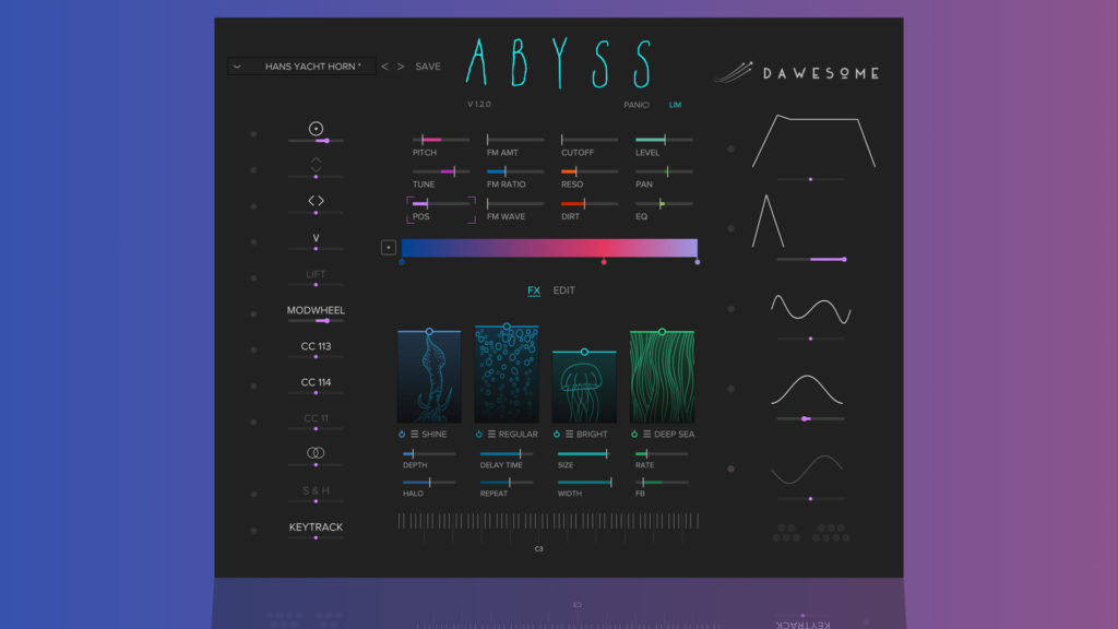 Además, Abyss 1.2 viene con el doble de presets: una biblioteca de más de trescientos sonidos gratuitos que incluyen un paquete de artista de más de setenta parches de Audilepsy, treinta parches de Databroth y un paquete de expansión gratuito de ochenta parches o más. El control deslizante LEVEL agregado al LFO permite la variación de la profundidad de modulación y la nueva capacidad de la pantalla táctil ayuda a la navegación rápida, lo que ayuda a mantener ese flujo creativo. Hablando de Abyss, el compositor Alex Pfeffer dijo: “Realmente asombroso, me siento instantáneamente inspirado. Demonios, sí, ¡esto suena muy orgánico! Es como una máquina submarina profesional”.