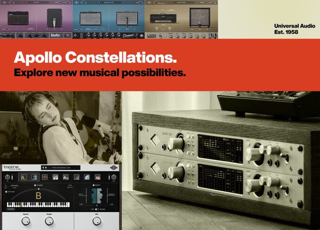Universal Audio anuncia Apollo Constellations, un lanzamiento de producto especial que gira en torno a su nueva gama de interfaces de audio Apollo X | Gen 2 y al nuevo y potente software UAD, que incluye Topline Vocal Suite, una solución integral para la producción vocal moderna y los plugins de emulación de amplificadores de guitarra UAD Dream ’65, Ruby ’63 y Lion ’68.