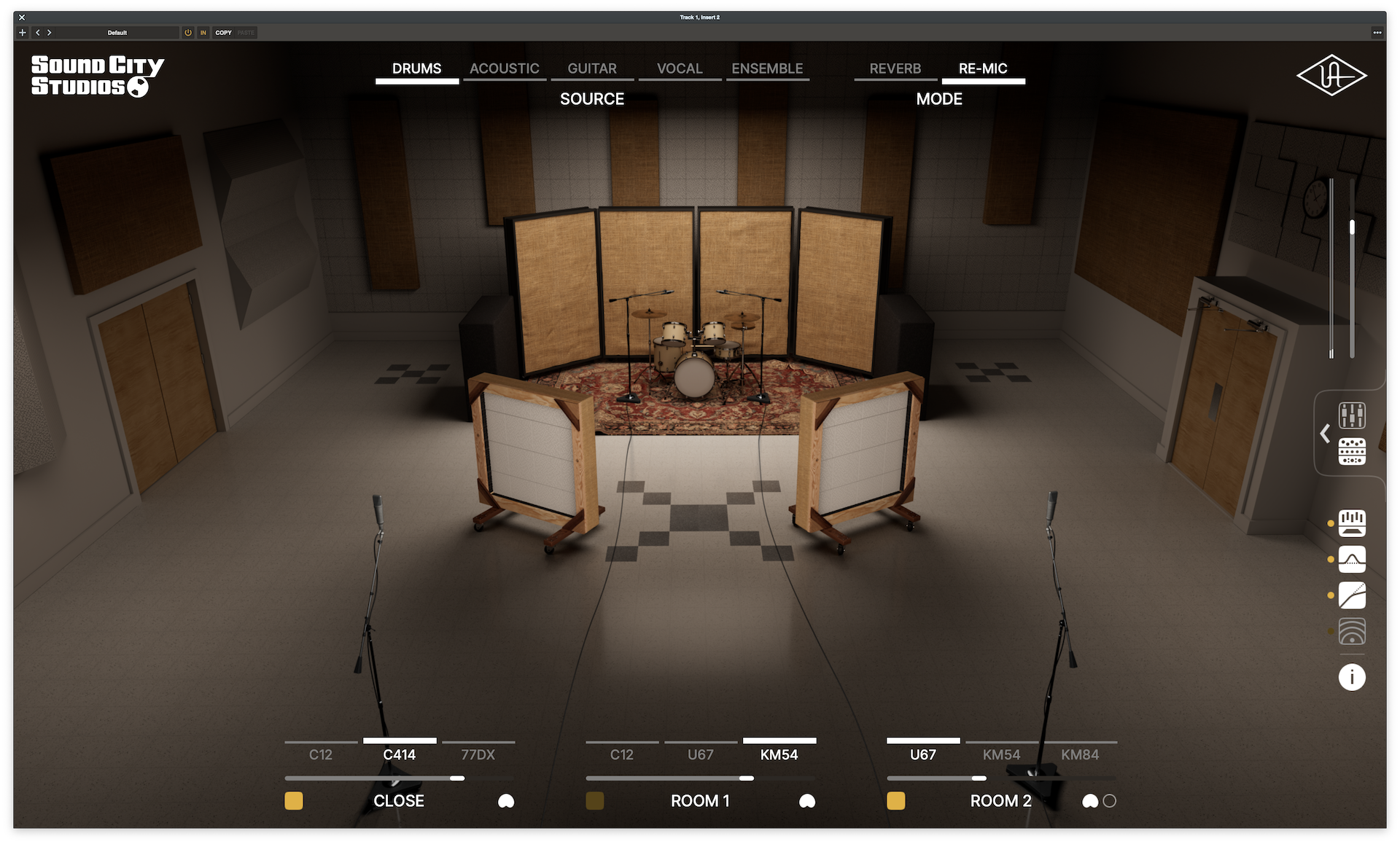 UAD Sound City Studios le permite marcar sonidos rápidamente eligiendo su fuente y seleccionando entre presets basados en combinaciones de sala y micrófono perfeccionadas. Utilizando la tecnología Dynamic Room Modeling, mueva micrófonos clásicos de condensador y de cinta, en tiempo real, para lograr una autenticidad mucho más allá de los plugins estáticos de modelado de salas basados en IR.