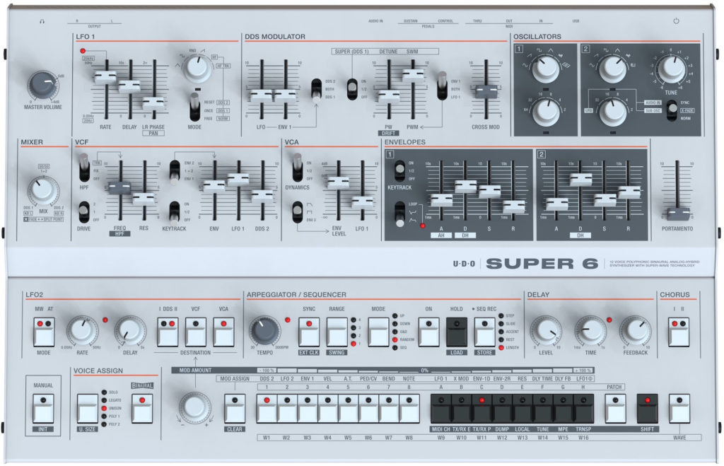 Por supuesto, esas características ya superlativas de Super 6, que representan en sí mismas una nueva versión del sintetizador analógico tradicional, también se incluyen en el Super 6 Desktop: calidad de construcción superior y control práctico intuitivo para interpretaciones expresivas, osciladores de última generación basados en FPGA con DDS (síntesis digital directa) y formas de onda descargables, siendo DDS 1 (oscilador 1) un núcleo de oscilador de súper ondas basado en FPGA muestreado a 50 MHz con un oscilador centroide y seis osciladores hermanos que se puede eliminar dinámicamente en el campo estéreo, por lo que se destaca BINAURAL y SUPER-WAVE; VCF analógico real, que repite el SSM2044 del antiguo fabricante de chips Solid State Micro Technology, VCA y moduladores; ENVELOPES, LFO y moduladores con capacidad de loop con modulación de frecuencia de audio; ARPEGGIADOR / SECUENCIADOR multimodo sincronizable con MIDI; CHORUS estéreo de modo dual y DELAY estéreo sincronizable y modulable, ambos con procesamiento de 24 bits/192 kHz.