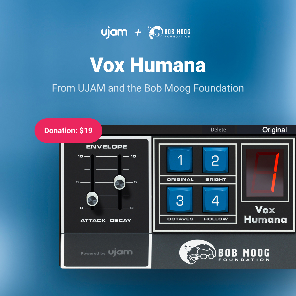 El plugin de Vox Humana está disponible por $19 / €22 como plugin VST3, AAX y AU para Mac y Windows. Para ver el impacto actual de esta colaboración, incluyendo un recuento en tiempo real de la cantidad de dinero recaudada en apoyo a la Fundación Bob Moog, visite UJAM.com.
