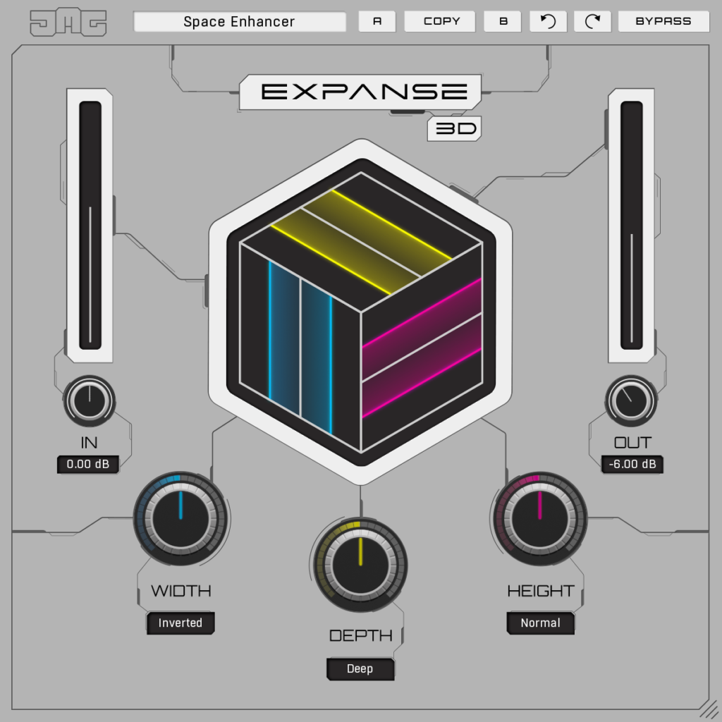 Es ampliamente aceptado, a pesar de los terraplanistas, que el mundo no es plano. ¿Por qué conformarse con la creación de música con un sonido plano cuando se avanzan milenios en el mundo de la producción actual impulsado por DAW? Expanse 3D, el último plug-in de JMG Sound, que se especializa en hacer uso de técnicas complejas de procesamiento de audio pero equilibrándolas con controles fáciles de usar, incluye tres tres de estos últimos; WIDTH, DEPTH y HEIGHT (con dos, tres y cuatro modos algorítmicos asociados para elegir respectivamente), así como el autoexplicativo IN (que controla la ganancia de entrada con un rango de -24dB a +24dB) y OUT (controla la ganancia de salida con un rango de -24dB a +24dB) Expanse 3D aplica un generoso polvo de magia psicoacústica para lograr la sensación tridimensional utilizando una combinación de saturación de tipo analógico, compensación de fase espectral, resíntesis, intrincadas redes de delay y más, lo que lo convierte en un candidato perfecto para la mezcla, masterización y diseño de sonido, lo que ayuda a unir los sonidos al tiempo que crea contraste y definición entre sonidos en una mezcla.