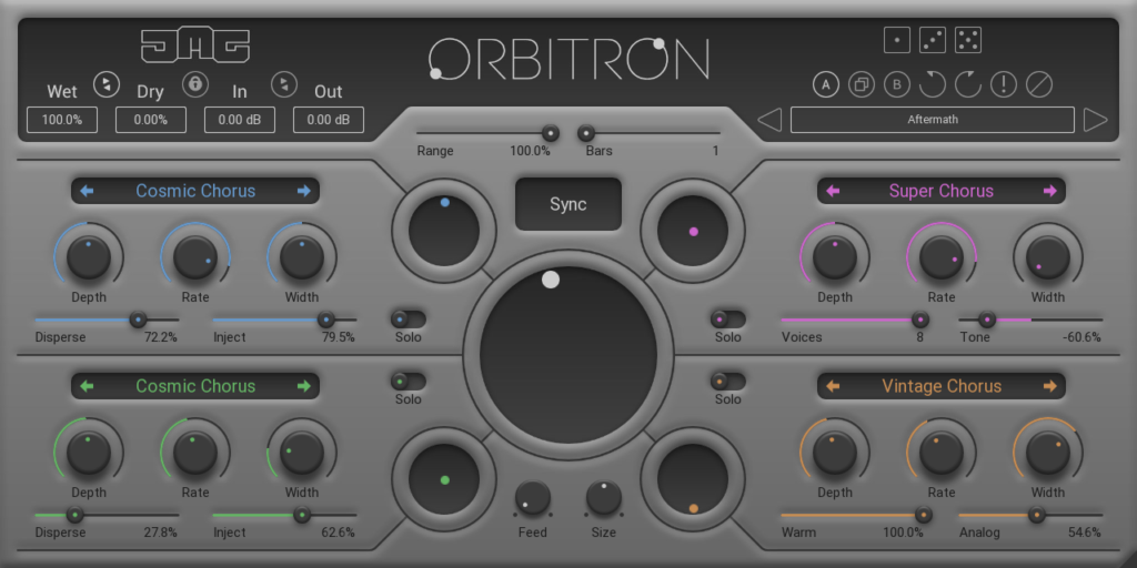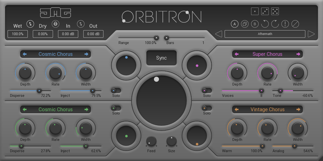 Como una herramienta de modulación múltiple que puede dar vida de manera creativa a instrumentos con sutiles variaciones orgánicas, engordar sonidos de sintetizador con ricos unísonos en evolución o crear resonancias giratorias rítmicas fuera de este mundo para un caos creativo completo, se pueden configurar cada una de las cuatro secciones de efectos de Orbitron a uno de los 12 modos: Chaos Vortex: un efecto giratorio multibanda, basado en el efecto Doppler, que es el cambio en la frecuencia de una onda en relación con un observador que se mueve en relación con la fuente de onda (con el ajuste Spin compensando el velocidades para las bandas, mientras que Radius compensa las distancias para las bandas); Cosmic Chorus: un chorus creativo de cuatro voces con delay y feedback para cada voz (con la configuración Disperse creando aleatorización en los tiempos de delay, mientras que Inject aumenta los niveles de feedback, enfocándose más en frecuencias más altas); Future Flanger: un flanger creativo con delay y feedback (con la configuración de Scream que aumenta el nivel de feedback para las voces con flanger, mientras que Stasis aumenta el tiempo de delay y disminuye el rango de modulación, reduciendo la resonancia); Infinite Combs: una serie de filtros de peine modulados que crean el efecto de tono Shepard, que crea la ilusión auditiva de un tono que parece ascender o descender continuamente en el tono, pero que finalmente no sube ni baja (con el ajuste de rango controlando el mínimo y el máximo frecuencia de los peines, mientras que Pattern selecciona la dirección del movimiento, con variaciones en la retroalimentación de los peines invertidos); Kinetic Resonator: un filtro con picos resonantes y frecuencias de modulación dentro de un bucle de retroalimentación (con la configuración de retroalimentación que controla el nivel de retroalimentación, mientras que Type selecciona el tipo de filtro); Liquid Filter: un filtro HP/LP transformable con cortes de barrido (con ajuste de resonancia que controla la cantidad de resonancia en relación con la frecuencia; los valores negativos tienen el efecto opuesto, mientras que Morph distribuye el rango de modulación entre HP y LP, donde una mezcla de ambos es esencialmente paso de banda); Phat Phaser: un phaser moderno que oscila entre 200Hz y 2kHz (con el ajuste Complexity seleccionando el número de líneas de delay utilizadas, mientras que Talk controla los niveles de feedback); Rotary Speaker: un gabinete de altavoz giratorio clásico simulado (con el ajuste de relación que compensa las distancias de los altavoces entre sí, mientras que Fast multiplica la velocidad para emular el clásico sonido giratorio rápido); Space Time: una matriz multibanda y multi-tap de líneas de delay moduladas (con la configuración Metalize controlando el nivel de una red de retroalimentación compleja, mientras que Diffract sesga los valores de retardo, cambiando el carácter del sonido) Super Chorus: un chorus moderno, limpio y ajustado (con el ajuste Voices seleccionando el número de voces utilizadas en el algoritmo, mientras que Tone enfoca las voces a frecuencias más altas o más bajas); Tape Flanger: un flanger de cinta analógico clásico (con ajuste de saturación que agrega distorsión de cinta y se centra más en las frecuencias más bajas, mientras que Double se mezcla en un segundo flanger 50% más rápido con tiempos de retardo aumentados) y Vintage Chorus: un chorus clásico de dos voces con un sonido rico y grueso (con un ajuste analógico que crea variaciones aleatorias en cada voz, mientras que Warm agrega saturación a las voces y reduce algunas frecuencias altas).