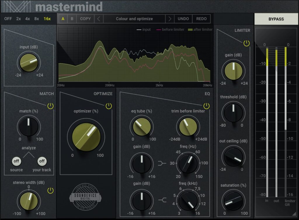 Un plugin de masterización desarrollado por SounDevice Digital con una excelente funcionalidad OPTIMIZE y (EQ) MATCH