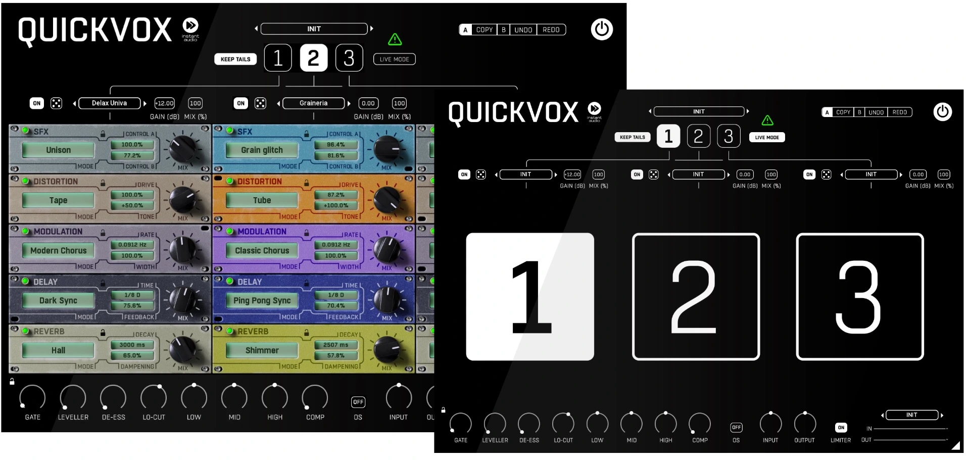 QuickVox cuenta con tres unidades de rack independientes e idénticas que permiten a los usuarios crear cadenas de efectos únicas para diferentes partes de una canción, como estrofas, coros e intros. Estos ajustes se pueden cambiar al instante para una máxima flexibilidad en el escenario. Cada rack alberga cinco potentes módulos de efectos, cada uno con tres controles sencillos, lo que permite una amplia paleta de sonidos. Los usuarios pueden transformar las voces con 11 efectos especiales, incluyendo vocoders, autotune, filtros peine rítmicos y moduladores de anillo experimentales. Para añadir crudeza o agresividad, dispone de 8 tipos de distorsión, como válvulas, saturación de cinta, plegamiento y simulaciones de amplificador. QuickVox ofrece efectos de modulación como chorus, trémolo, flanger y phaser para inyectar movimiento y profundidad. Los usuarios también pueden crear ritmos intrincados y paisajes sonoros expansivos con efectos de retardo como digital, cinta, ping-pong estéreo y amplios retardos amplios. Además, pueden colocar las voces en el espacio acústico perfecto con 12 tipos de reverberación, desde una sala íntima hasta una gran sala o catedral. Una completa sección de mezcla perfecciona el sonido con compuerta, nivelador, de-esser, ecualizador musical y un potente compresor.