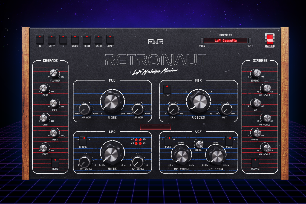 Retronaut está inspirado en viejos equipos analógicos con los que los oídos sabios que dan la bienvenida a la calidez ya estarán familiarizados. El plugin nos regresa a esa magia musical nostálgica del pasado, con múltiples formas de envejecer y degradar la señal (DEGRADE) que se procesa, gracias a los controles FLUTTER (agrega fluctuaciones aleatorias a la forma de modulación, simulando el flutter de cinta); DUST (agrega ruido a la forma de modulación); FAIL (agrega fallas aleatorias de tono y caídas de nivel para simular un viejo equipo defectuoso); WARP (agrega cambio de tono y un poco de trémolo a la mitad de frecuencia a todas las VOCES); DIRT (controla la cantidad de saturación estilo cinta); FEED (controla la cantidad de cross-feedback tomando las salidas de las voces y alimentándolas entre sí) y MONO (cambia la señal a mono, simulando equipos antiguos con un solo altavoz, como radios).
