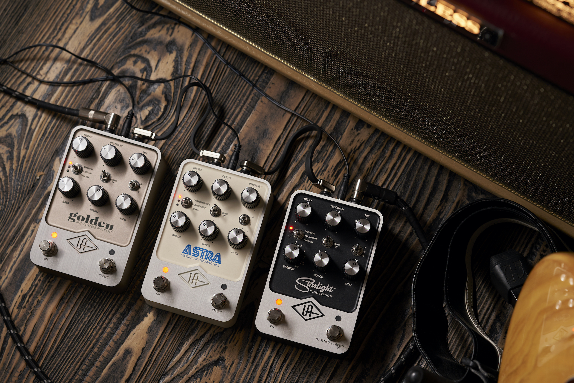 Como resultado de un exhaustivo esfuerzo de I+D de varios años, los pedales UAFX Golden Reverberator, Starlight Echo Station y Astra Modulation Machine traen una poderosa arquitectura de doble procesador al mercado de los pedales de efectos, entregando tres sonidos vintage distintos por pedal, con un impecable diseño analógico UA y construcción de calidad.