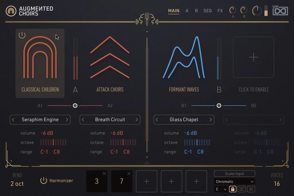 Impulsado por un creativo motor de 4 capas, Augmented Choirs combina un sampling de primera clase con síntesis avanzada para una amplia variedad tímbrica. Envolventes independientes, filtros, efectos y un fraseador/arpegiador integrado te permiten transformar coros tradicionales en texturas cinematográficas, pads etéreos, pulsos rítmicos y efectos vocales experimentales en un instante.