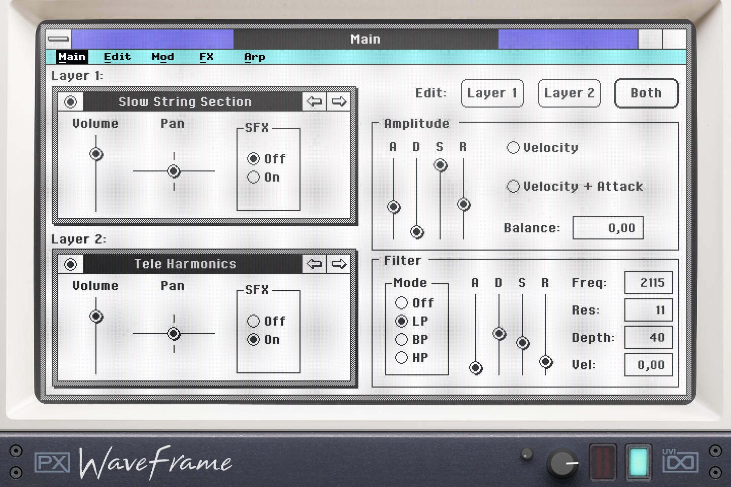 Desde pads exuberantes y paisajes sonoros en evolución hasta bajos de vanguardia y texturas cinematográficas, PX WaveFrame está repleto de una paleta expansiva adecuada tanto para el género moderno como para el diseño de sonido creativo. Explora teclados, guitarras, bajos, cuerdas, metales, instrumentos de viento de madera, sintetizadores, baterías, efectos y más. Luego toma el control con un conjunto de herramientas familiar que incluye envolventes ADSR por capa, filtros multimodo, modo poli y mono con deslizamiento, modulación, efectos de calidad de estudio que incluyen ecualizador de 3 bandas, drive, Thorus, ensemble, Phasor, delay digital y Sparkverb. Acompáñalo con un par de arpegiadores con muchas funciones y tendrás los sonidos auténticos del sistema original con un conjunto de herramientas moderno y actualizado con el que experimentar.