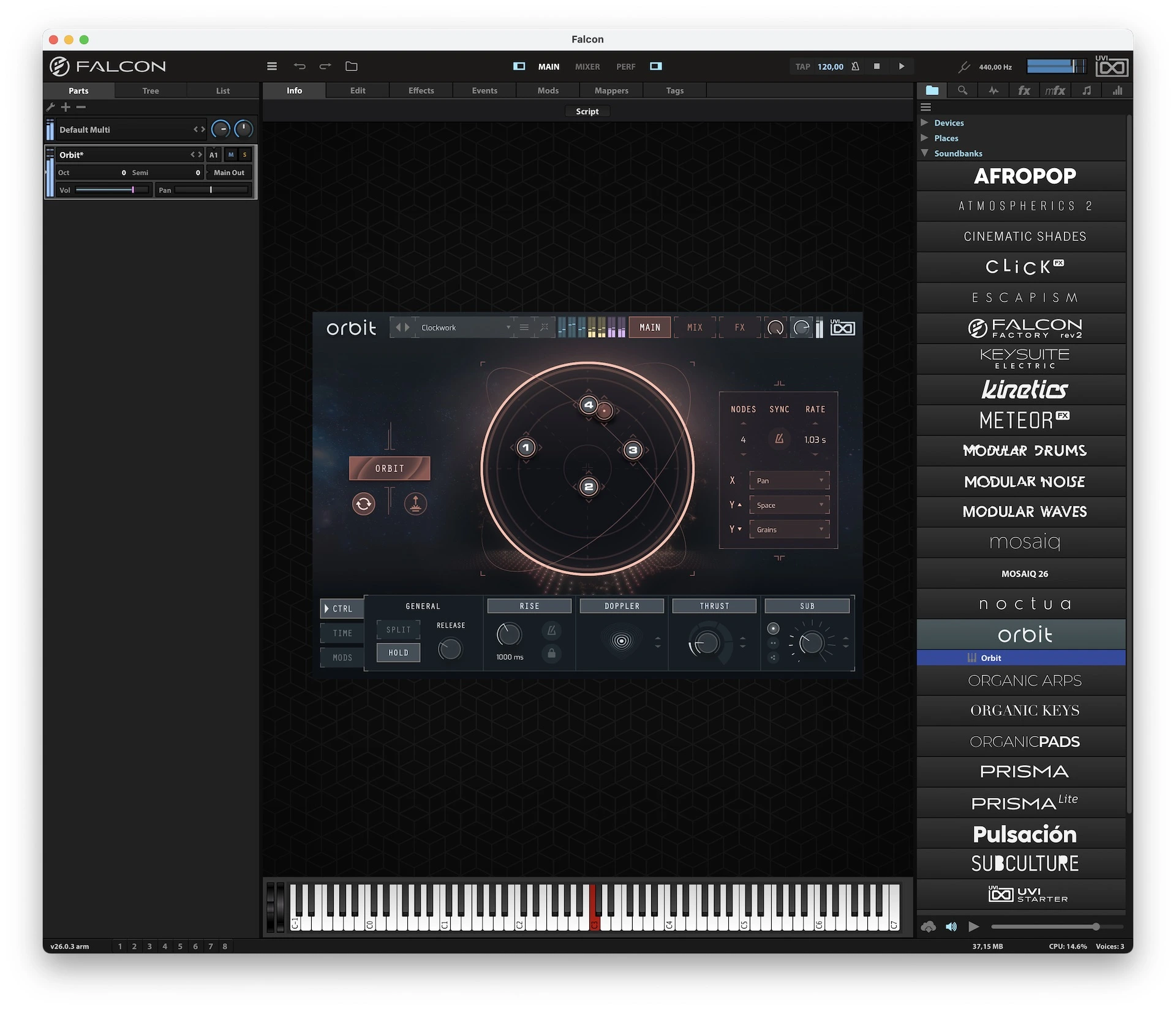 Orbit ofrece funcionamiento autónomo nativo de 64 bits a través de Falcon o la estación de trabajo UVI gratuita, lo que proporciona compatibilidad completa con todas las DAW modernas y autorización simultánea en hasta 3 ordenadores o llaves iLok.