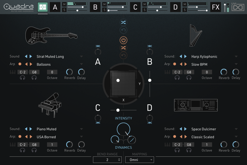Quadra: Muted & Harmonics es un instrumento versátil, capaz de una amplia gama de aplicaciones, desde arpegios de cuerda clásicos hasta guitarras armoniosas, bajos y líneas de sintetizador con estrías, hasta bancos de sonido cinematográficos oscuros y melancólicos, en cualquier lugar intermedio y mucho más allá. Cargado con una gran selección de guitarras, acústicas y eléctricas, y bajos de Fender, PRS, Gibson, Chapman y otros, pianos, teclados eléctricos, FM, sintetizadores analógicos y de modelado, instrumentos de cuerda clásicos y del mundo y más, los usuarios son libres de explorar y crear voces complejas en capas, progresiones adaptativas y secuencias deslumbrantes con un conjunto de herramientas enfocado e inspirador.