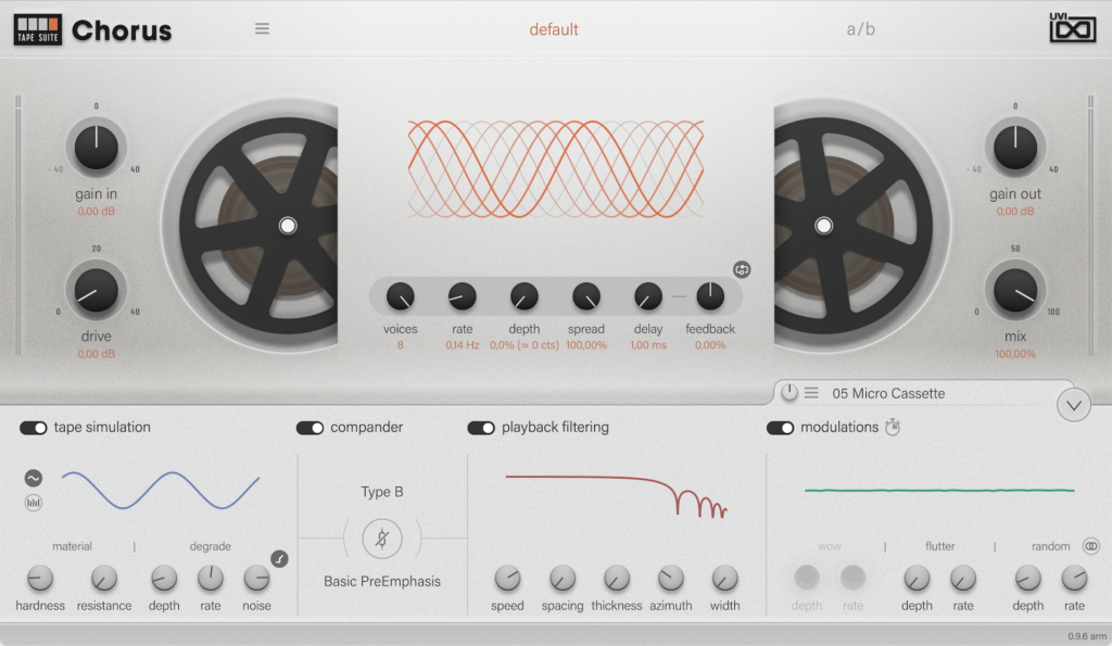 El trabajo pesado de la simulación de Tape Suite se presenta en 4 secciones principales, disponibles a través del editor inferior de cada plugin. La simulación de cinta proporciona un modelo novedoso de magnetización, que reproduce fielmente una amplia gama de materiales magnéticos. Compander incluye 3 modelos diferentes de etapas de codificación y decodificación de reducción de ruido que históricamente se encuentran en las máquinas de cinta. El filtrado de reproducción modela las características del cabezal de reproducción de cinta con control preciso sobre la velocidad, la distancia del cabezal, el ángulo y el ancho, mientras que la modulación modela el transporte de la cinta, proporcionando una desafinación, sorpresa y aleteo profundamente naturales.