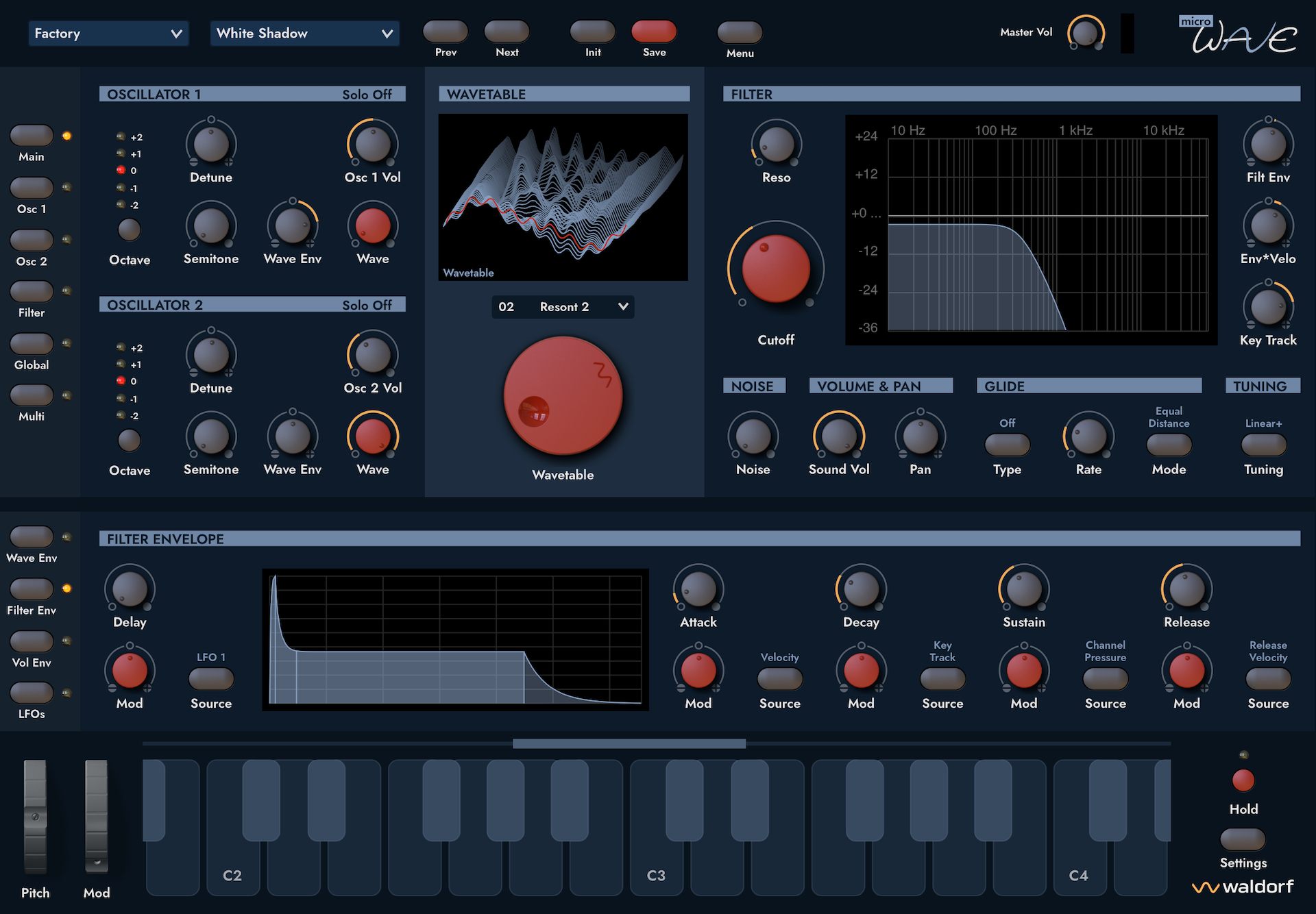 Un esfuerzo de varios años y un trabajo de amor que analizó y modeló los instrumentos originales hasta los detalles sonoros más finos de cada aspecto del hardware. Solo la primera generación del Microwave y también el Waldorf Wave se basaron en un circuito integrado desarrollado a medida llamado Waldorf ASIC. En combinación con los legendarios chips de filtro Curtis y un software controlador basado en CPU de 68k muy exclusivo, el ASIC definió un sabor muy especial de sonido de tabla de ondas sin igual. Nadie más que el inventor de la síntesis de tabla de ondas de los años ochenta, Wolfgang Palm, ayudó a diseñar este chip único. Waldorf realizó un gran esfuerzo para analizar y recrear este circuito integrado. Al igual que el original, las aplicaciones ejecutan la síntesis interna con la frecuencia de muestreo ultra alta de 250kHz independientemente de la frecuencia de muestreo del dispositivo. Las formas de onda digitales recreadas se compararon bit a bit con el original para que sean 100% idénticas.