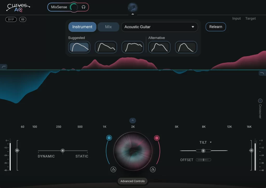 - “Control deslizante Estático/Dinámico”: AQ ofrece ecualización estática y dinámica, lo que te da la flexibilidad de trabajar de forma totalmente estática, dinámica o con una combinación de ambas. “Smart Tilt” remodela el objetivo espectral con potentes ajustes tonales, mientras que “Offset” desplaza la curva del objetivo a lo largo del eje X, reposicionando la frecuencia fundamental y los armónicos para crear efectos creativos.