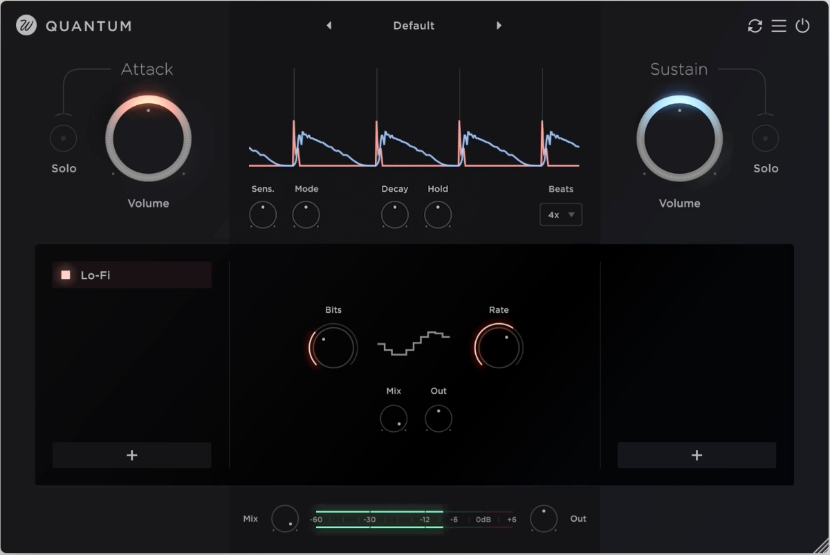 Quantum detecta y clasifica automáticamente los transitorios de su señal, separando el sonido en dos caminos: ataque y sustain. El nivel de control que tiene ahora es incomparable, lo que le brinda la posibilidad de agregar efectos a cada ruta por separado, antes de volver a unirlos.