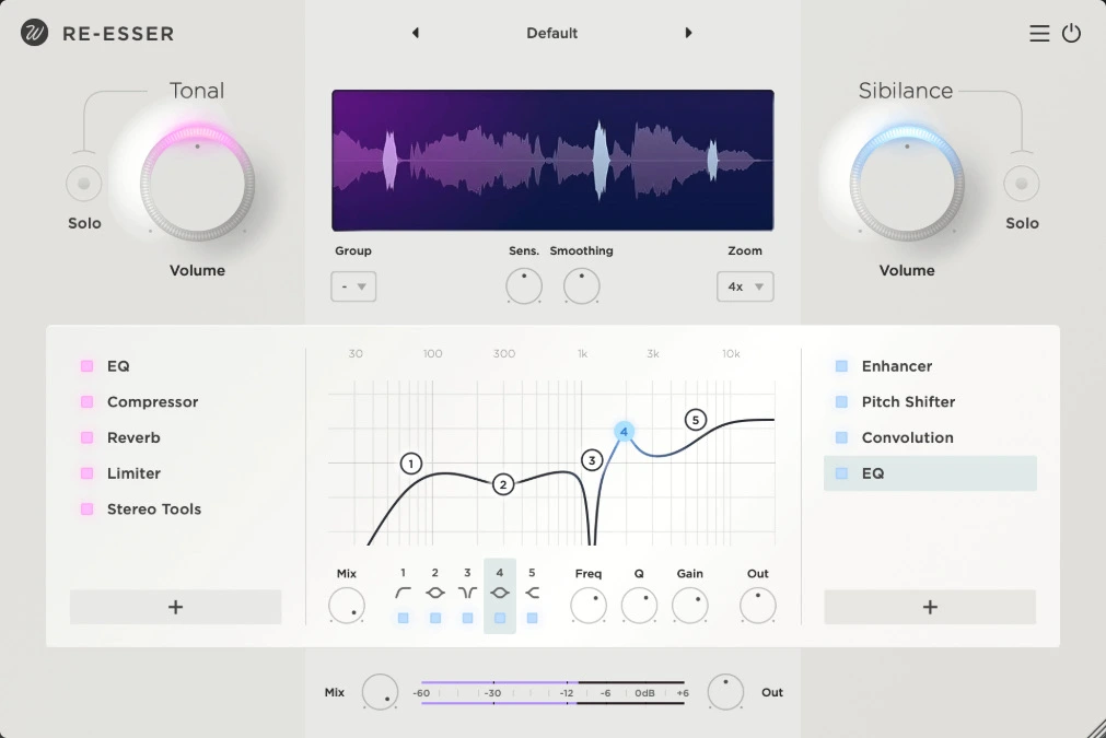 Re-Esser no es un de-esser cualquiera. Es un nuevo enfoque que separa el contenido sibilante del tonal, permitiendo que cada uno se moldee de forma independiente. Esto significa que los ingenieros finalmente pueden controlar la sibilancia sin sacrificar claridad, detalle ni musicalidad.