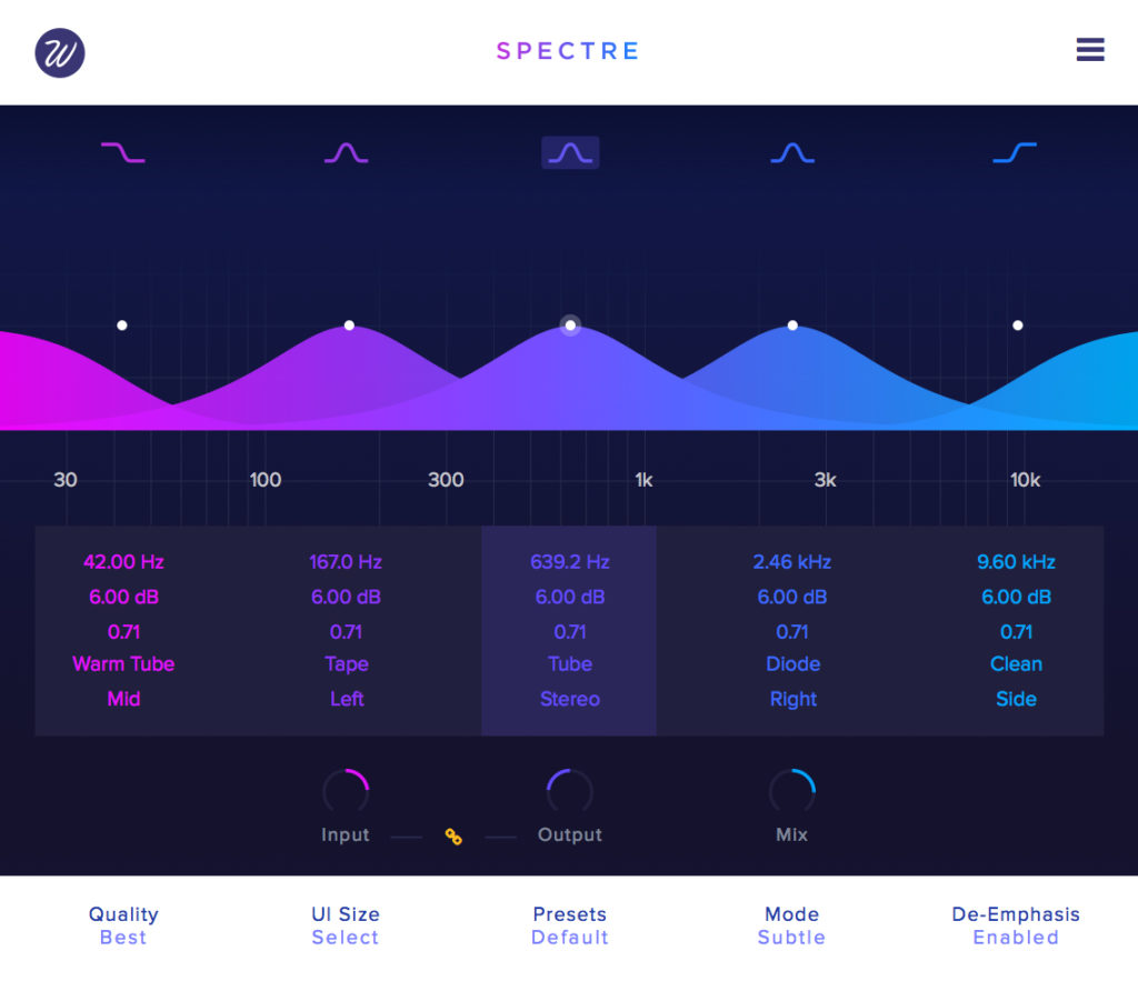 Specter es una herramienta de modelado de sonido que combina las mejores características de un potenciador de audio junto con el flujo de trabajo de un ecualizador paramétrico. Specter satura solo las partes del espectro que desee con diez algoritmos de saturación diferentes. Paul White describió a Specter en su reseña de Sound On Sound como “Un plug-in muy poderoso, tanto para tratar pistas individuales como para endulzar mezclas completas.”