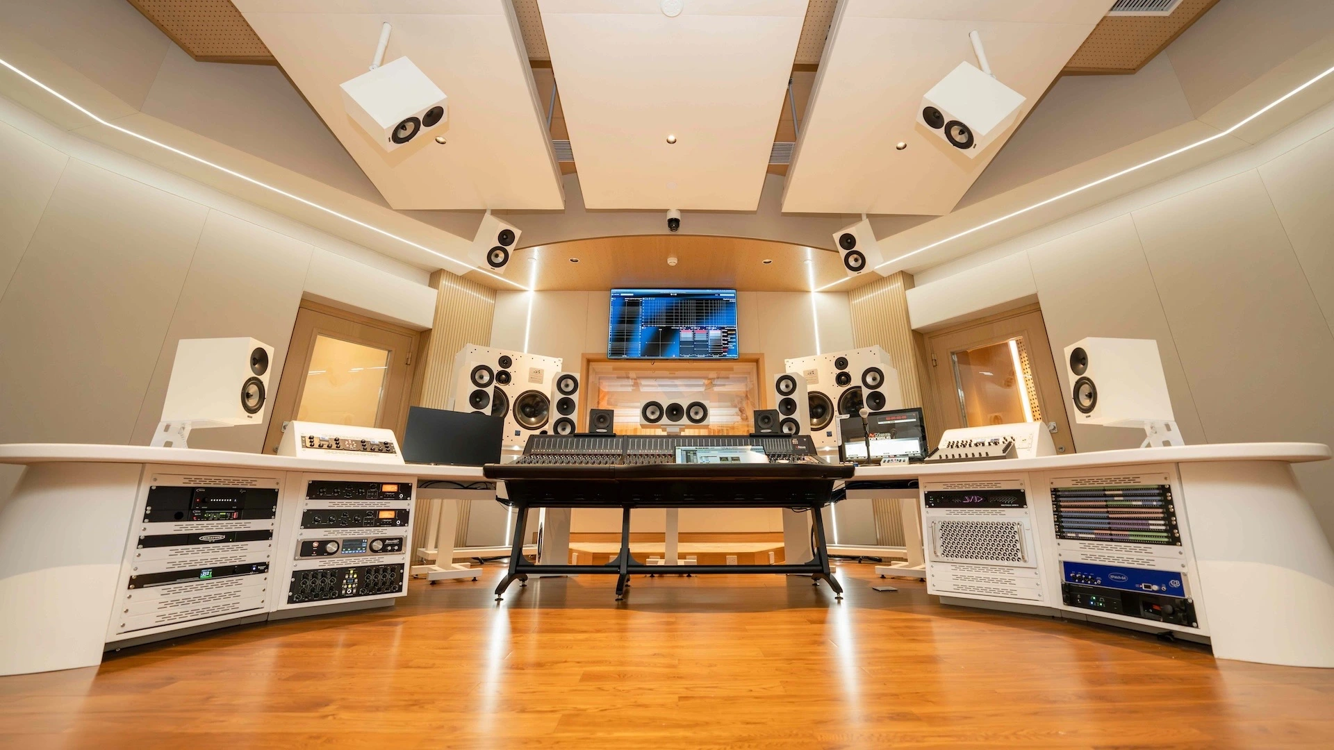 “El enfoque de diseño combinó la visión de Alibaba de espacios minimalistas y modernistas con las complejas exigencias técnicas de la producción audiovisual de primer nivel”, afirma Molho, quien lideró el desarrollo del diseño de los estudios. “Cada sala de control se diseñó como una entidad única con su propia lógica espacial, pero todas mantienen la cohesión visual mediante detalles en madera clara y mobiliario técnico a medida. Los techos curvos y los plafones fluidos no fueron solo decisiones estéticas, sino que sus geometrías se moldearon con precisión para mejorar el rendimiento acústico y visual. La iluminación juega un papel decisivo, siguiendo la orientación del tratamiento acústico para enfatizar la estructura y añadir movimiento mediante sutiles cambios de luminancia y color”.