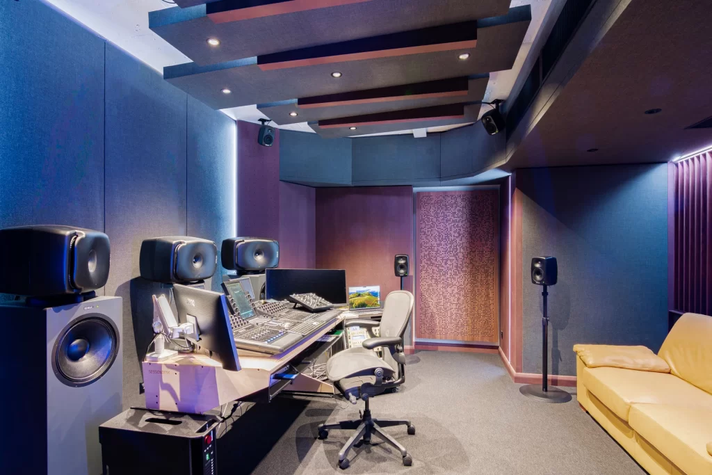 La configuración de altavoces incluye los monitores insignia “The Ones” 8361 de Genelec como monitores principales, subwoofers Genelec W371A y altavoces envolventes más pequeños alimentados por PoE. Todo el sistema está conectado en red, utiliza el protocolo Dante y se controla mediante un controlador Avid S4 y Pro Tools.