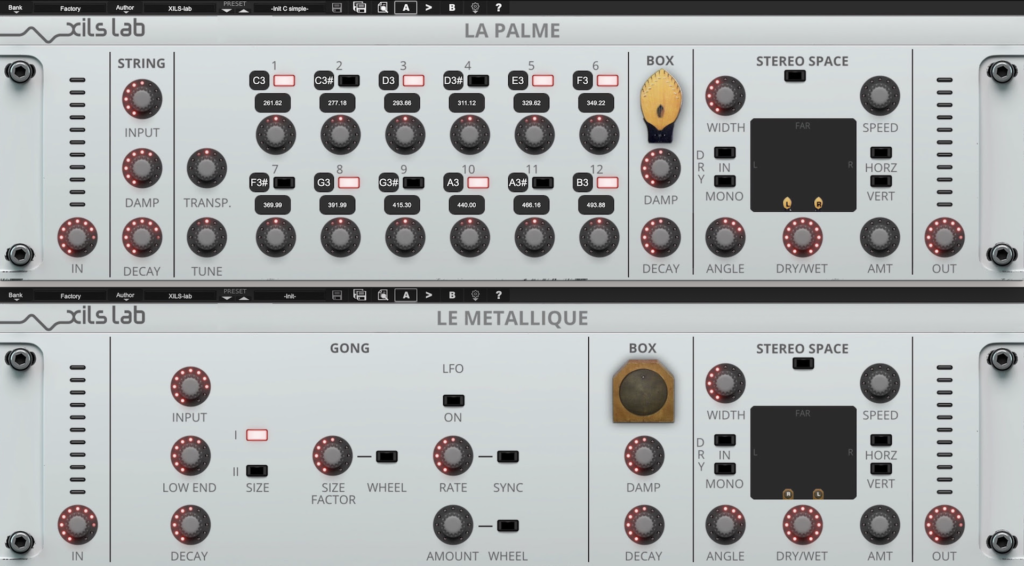 Además de esas cuerdas mutables y afinables individualmente, La Palme también cuenta con INPUT global, DAMP (más oscilaciones de cuerda equivalen a frecuencias menos altas), controles DECAY, TRANSPOSE y TUNE. El GONG de tamaño dual de Le Metallique se puede modular mediante un LFO o una RUEDA MIDI y también cuenta con controles de nivel de INPUT y frecuencia DAMP (más oscilaciones de gong equivalen a menos frecuencias altas), junto con controles de nivel DECAY y LOW END, además de un LFO que se puede sincronizar con el tempo del proyecto. La CAJA “de madera” central para el funcionamiento de cada plugin presenta más controles DECAY y DAMP.